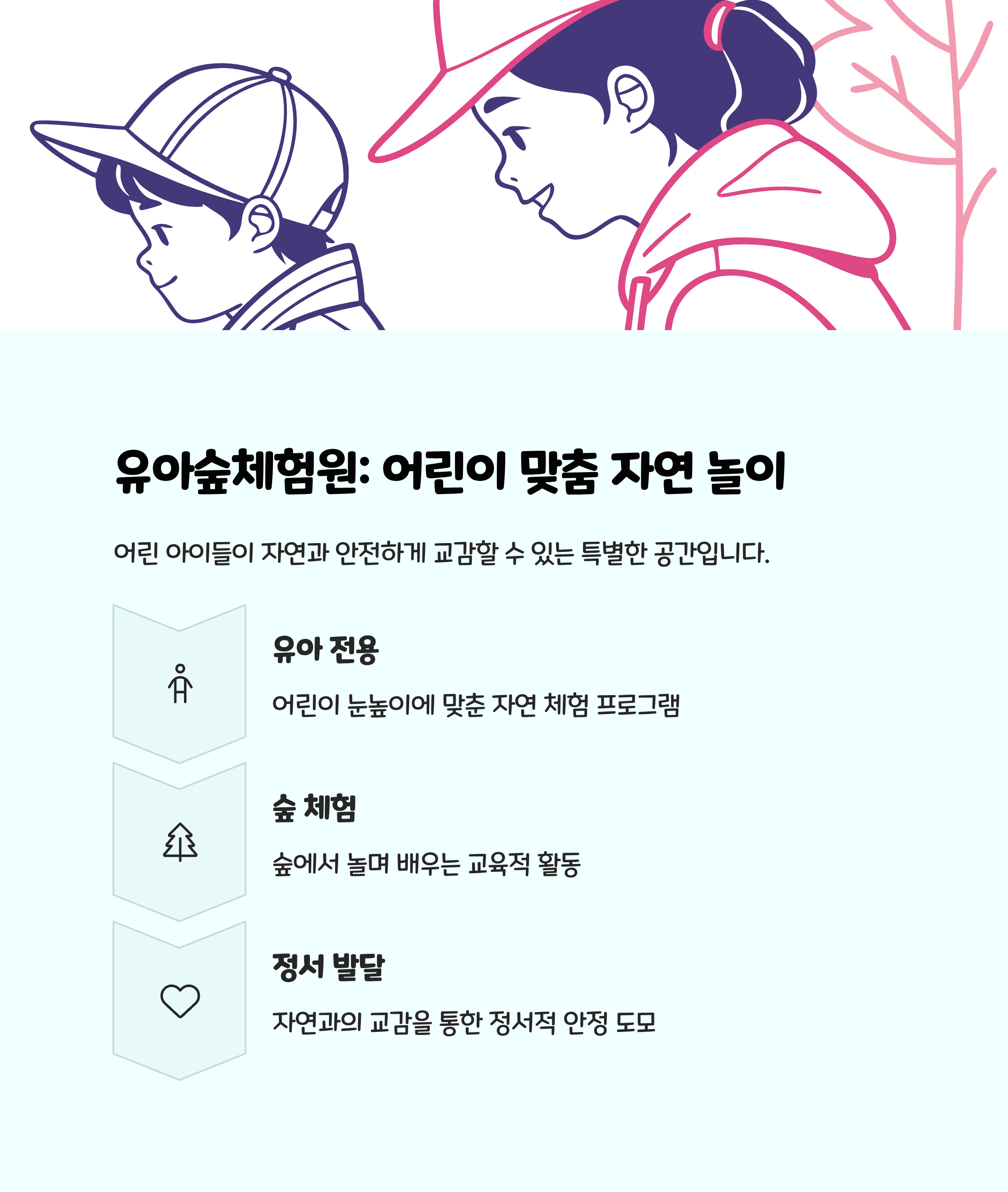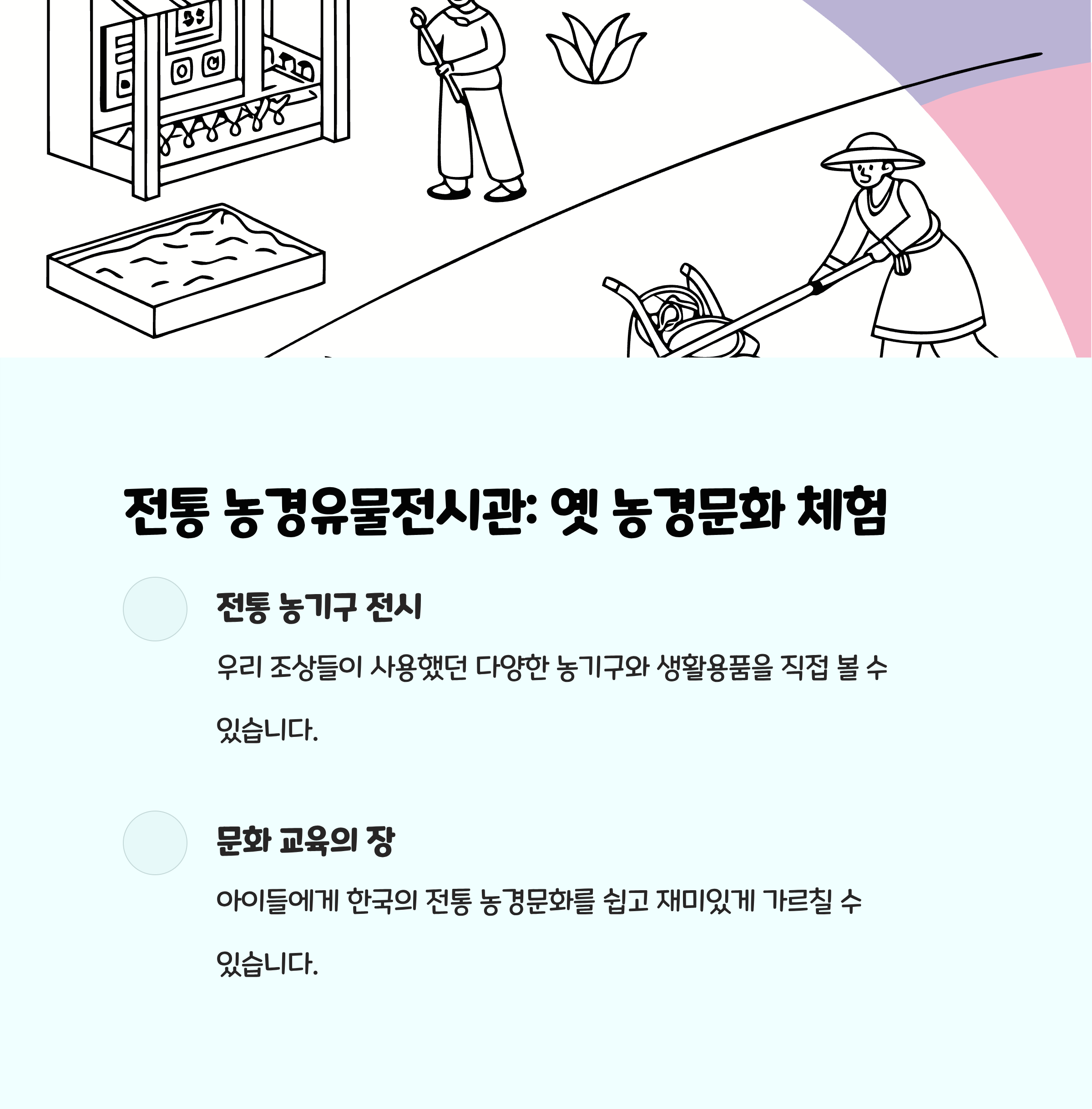 농경유물전시관에서는 전통 초가집과 농기구 180여 점이 전시되어 옛 농촌 생활을 경험할 수 있습니다. 유아를 위한 튼튼 유아숲체험원은 오감 발달과 정서 함양을 돕는 놀이 시설과 체험 공간으로 꾸며져 있어, 어린아이들과 함께 방문하기에 안성맞춤입니다.
