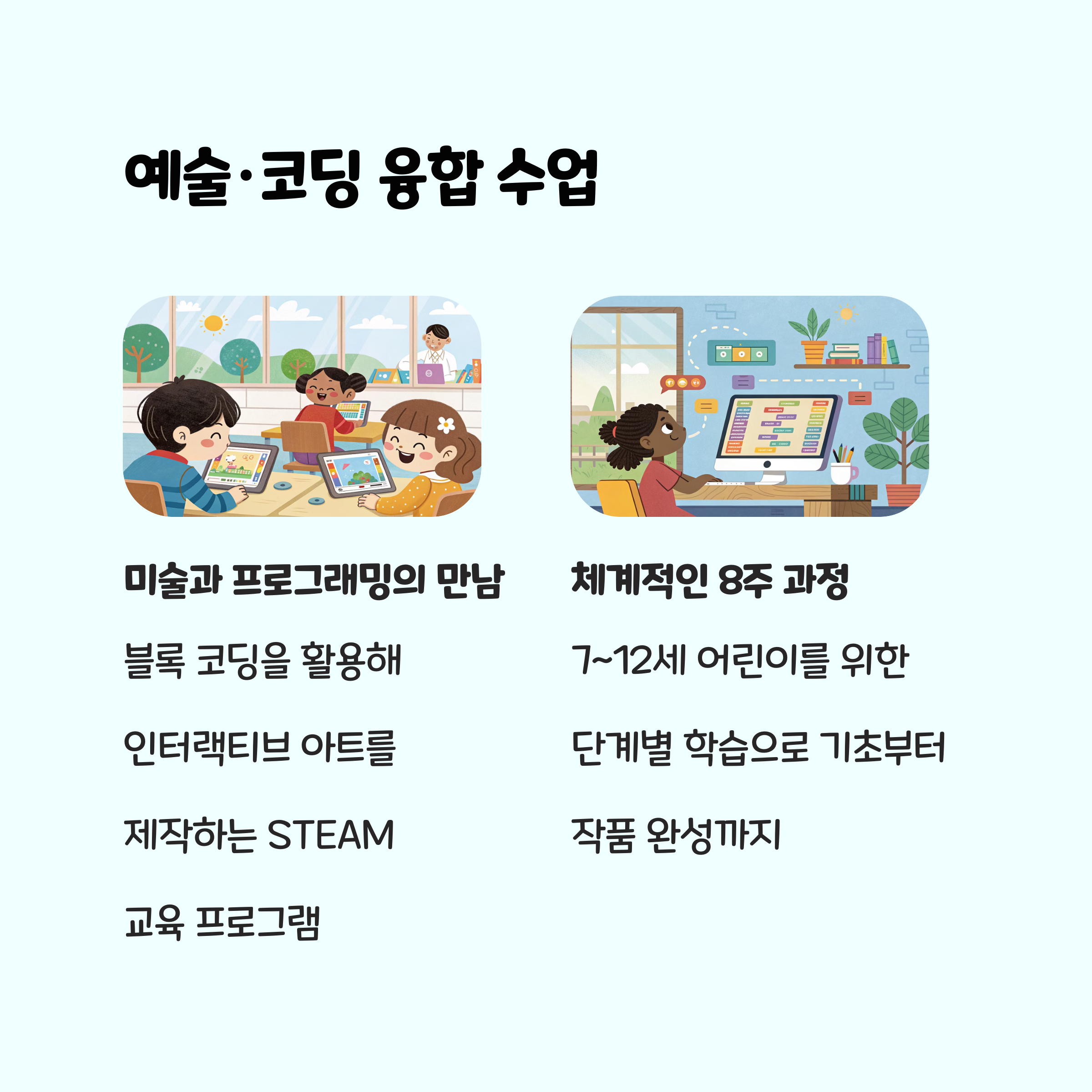 • 내용: 예술과 코딩을 융합한 창의 체험 수업으로, 아이들이 직접 작품을 만들고, 디지털 예술의 세계를 경험할 수 있습니다. 긴 여름방학 동안 새로운 분야에 도전하고 싶은 가족에게 추천합니다.