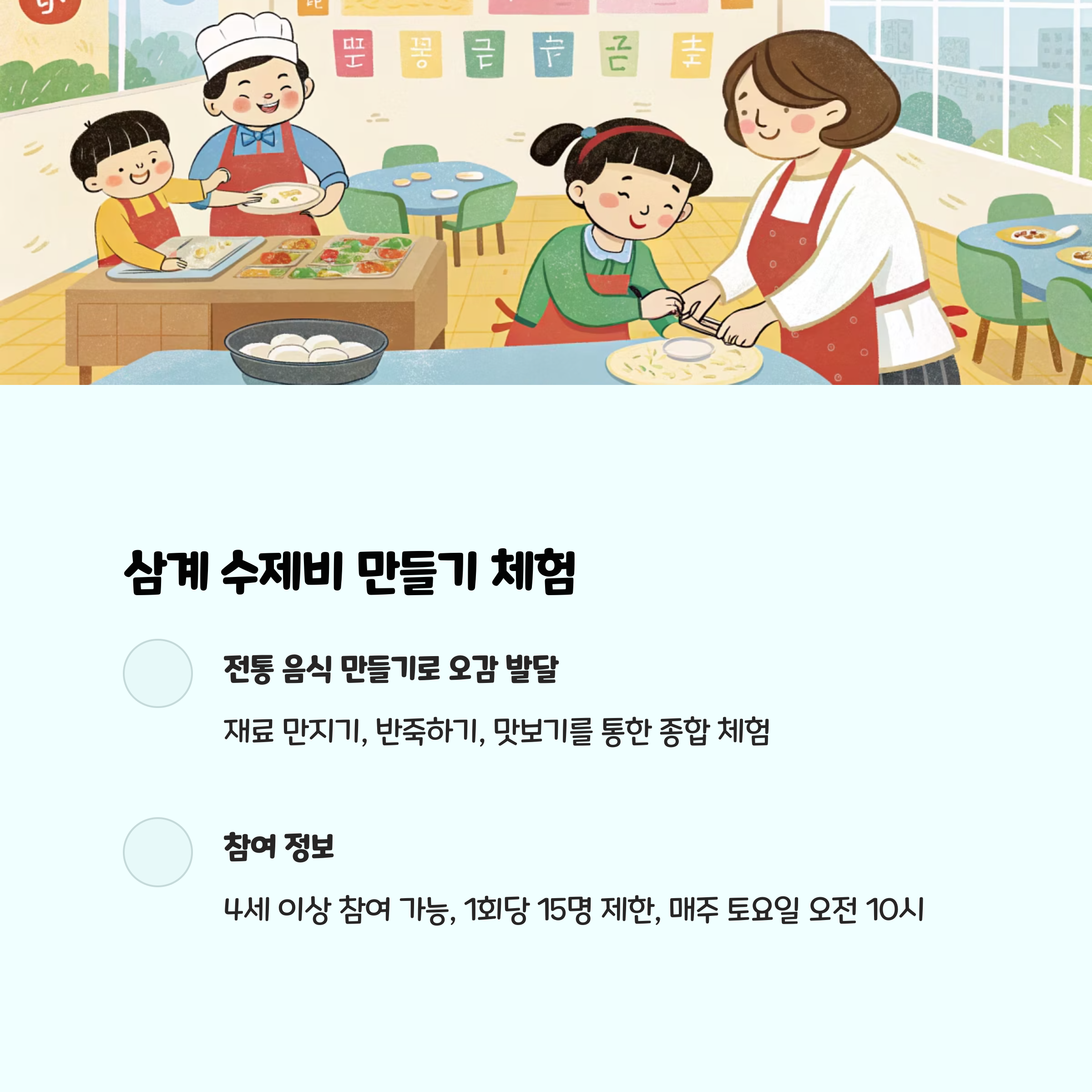 일정: 2025년 7월 5일(토) ~ 7월 27일(일) / 매주 토, 일요일 14:00~14:50대상: 4세 이상 어린이(보호자 1인 동반 필수)장소: 지하 1층 요리놀이실참가비: 15,000원(입장료 4,000원 별도)내용: 여름 절기 ‘대서’에 대해 배우고, 제철 재료로 닭 모양의 비건 삼계 수제비를 직접 만들어보는 체험입니다. 아이의 오감은 물론, 부모와의 협동심도 키울 수 있는 인기 프로그램입니다.