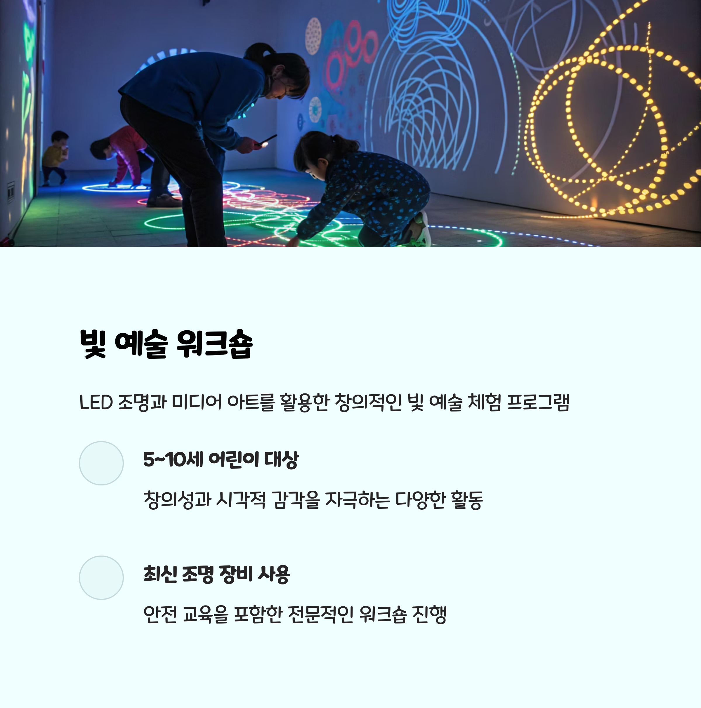 운영 기간: 2025년 7월~8월, 주말 및 공휴일(오후 4시, 50분간 진행)대상: 어린이(선착순 12명)참가비: 8,000원장소: 지하 1층 ‘빛의 방’특징: 빛을 활용한 감성 예술 활동으로, 아이들이 직접 빛을 조작하며 창의적으로 표현해보는 시간이 마련됩니다.