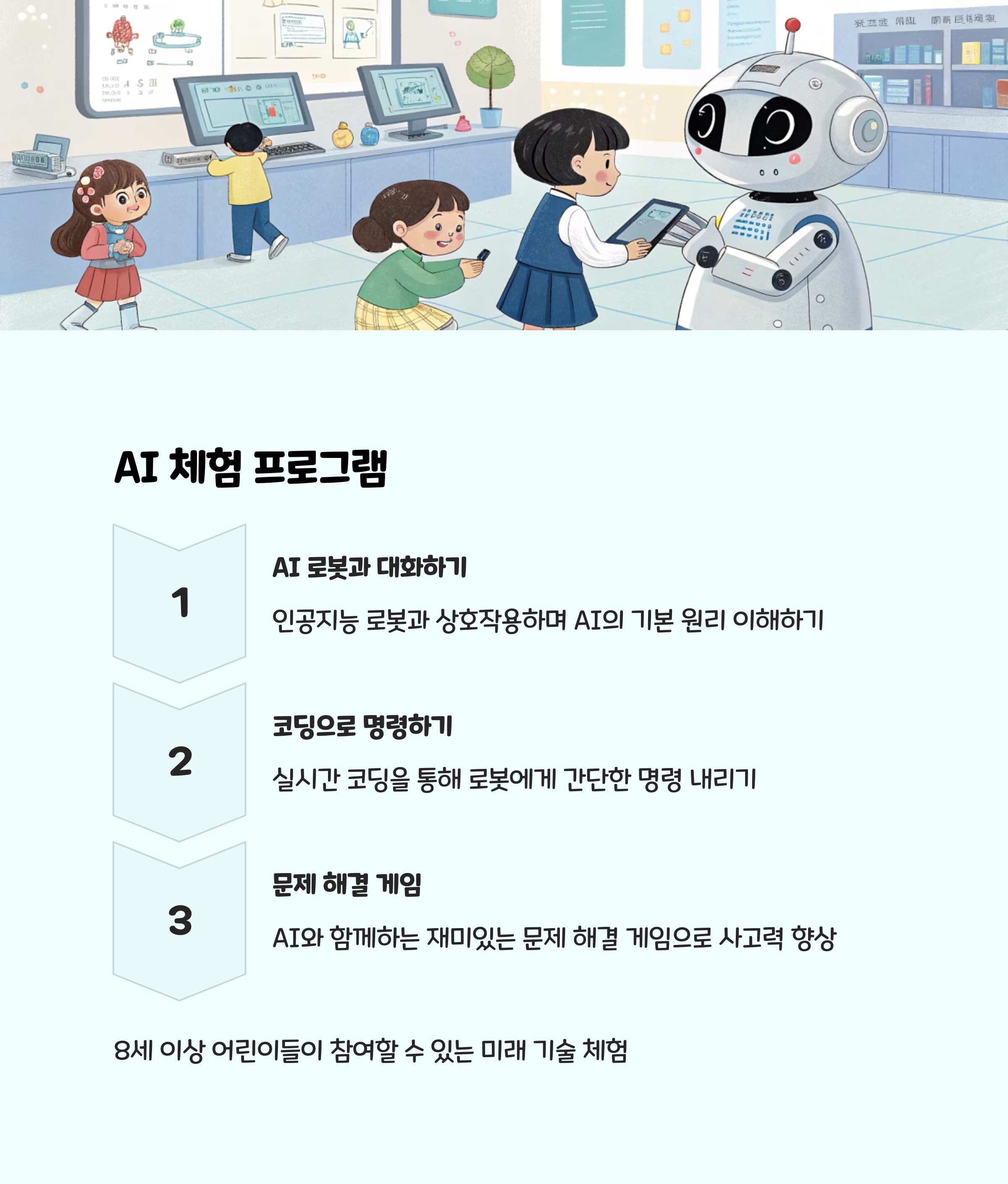 기간: 2025년 7월 29일(화) ~ 8월 1일(금), 총 4회차시간: 10:00~12:00 (초등 1~2학년) 14:00~16:00 (초등 3~4학년)장소: 지하 1층 창의놀이실내용: 예술과 코딩을 융합한 창의 체험 수업으로, 아이들이 직접 작품을 만들고, 디지털 예술의 세계를 경험할 수 있습니다. 긴 여름방학 동안 새로운 분야에 도전하고 싶은 가족에게 추천합니다.