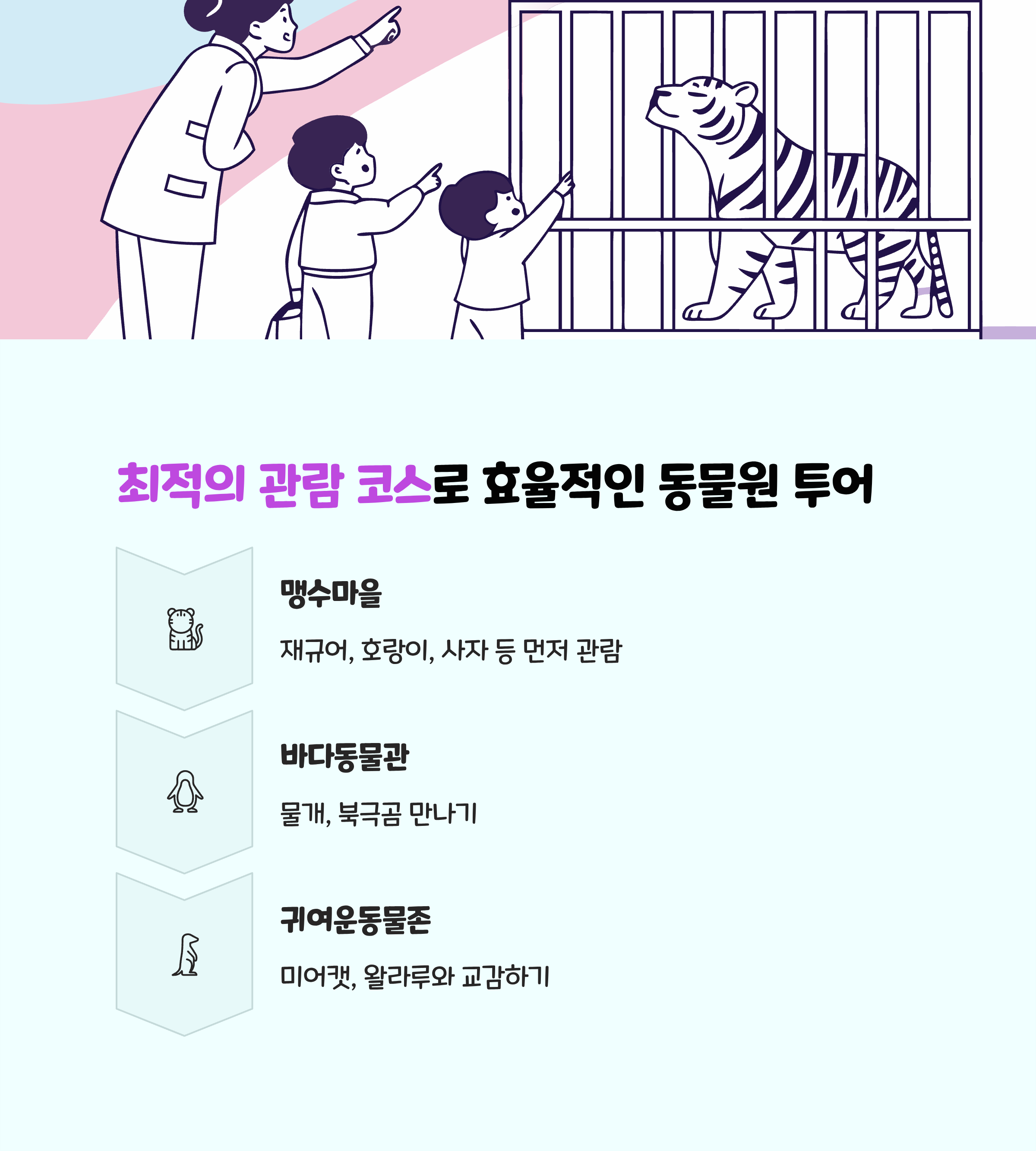 입구→분수광장→포토존(캐릭터존/공룡존)→맹수마을→바다동물관→귀여운동물존→실내동물관→놀이터/피크닉장- 맹수마을부터 시작하면 오전 중 활동적인 사자, 호랑이, 불곰, 아시아코끼리를 가까이서 볼 수 있고, 바다동물관(물개, 물범), 귀여운 동물존(미어캣, 왈라루, 원숭이, 미니말 등), 실내동물관(뱀, 트리포큐파인 등)은 흥미로운 동물과 희귀종 관람에 좋음.