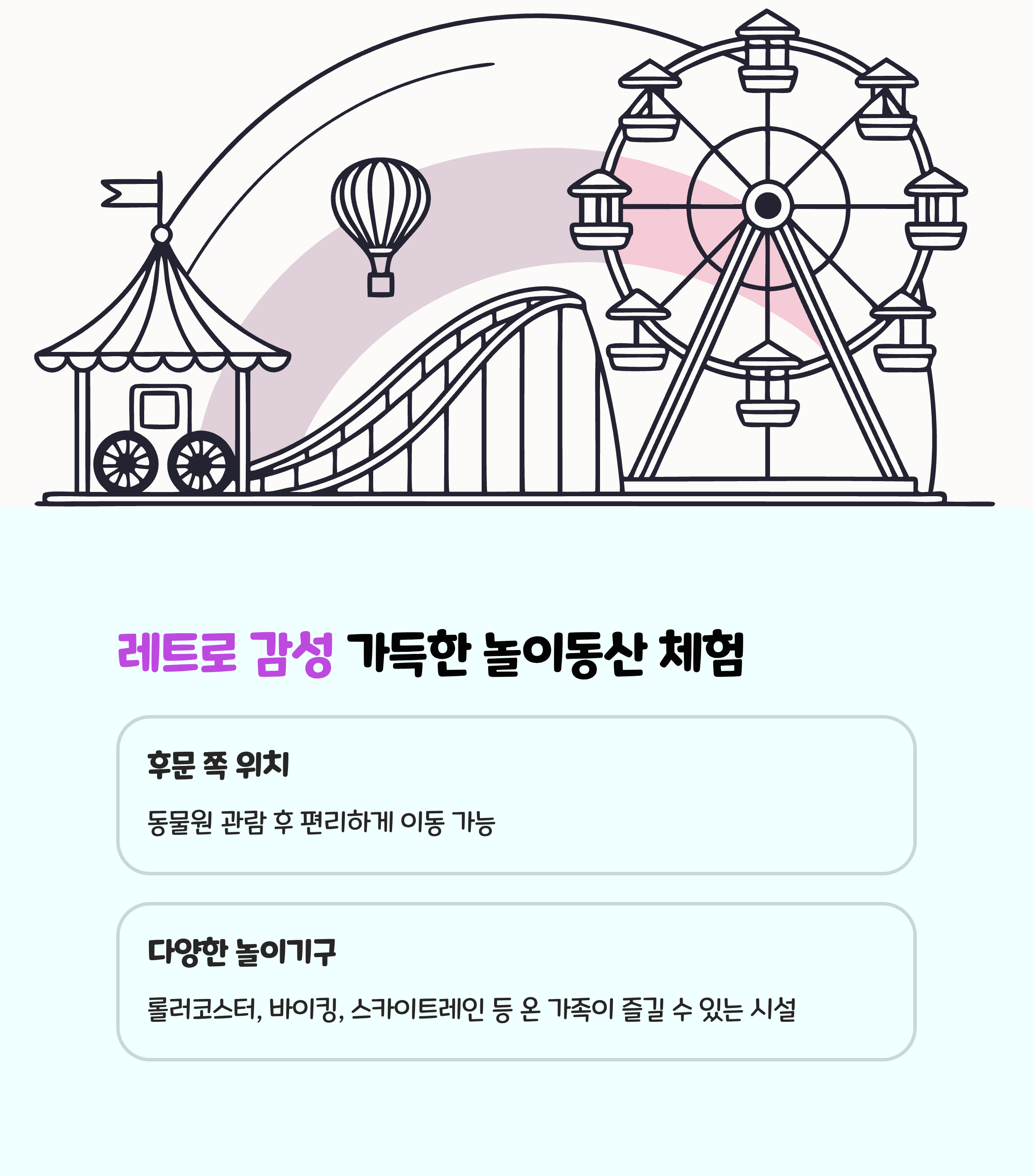 - 놀이동산(유료)에서는 회전목마, 롤러코스터 등 즐길 거리가 있어 아이들이 신나게 체험 가능.