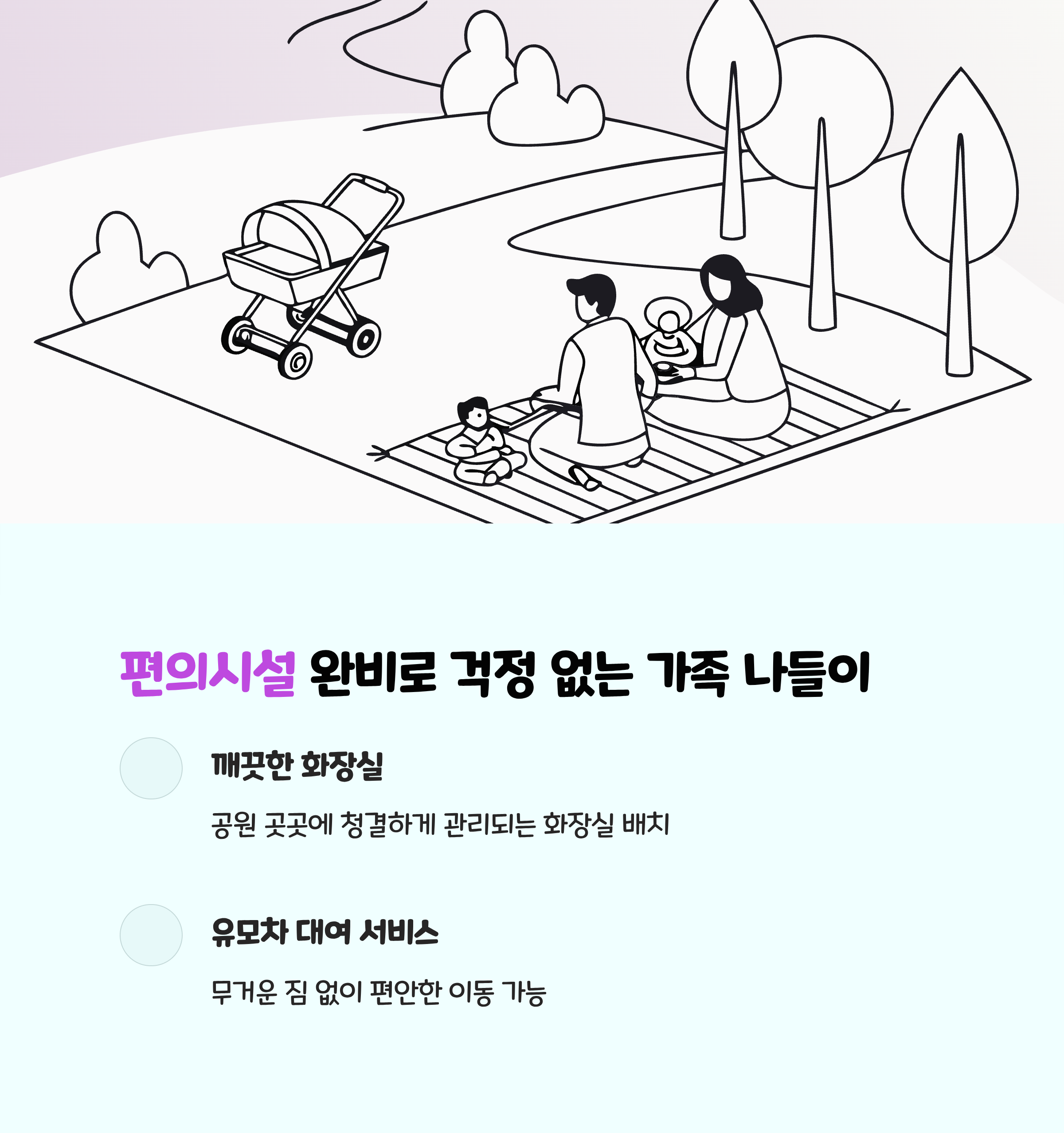 - 점심시간 즈음엔 잔디밭에서 도시락이나 간식으로 휴식·놀이를 즐기면서 가족사진 촬영으로 기록 남기기.