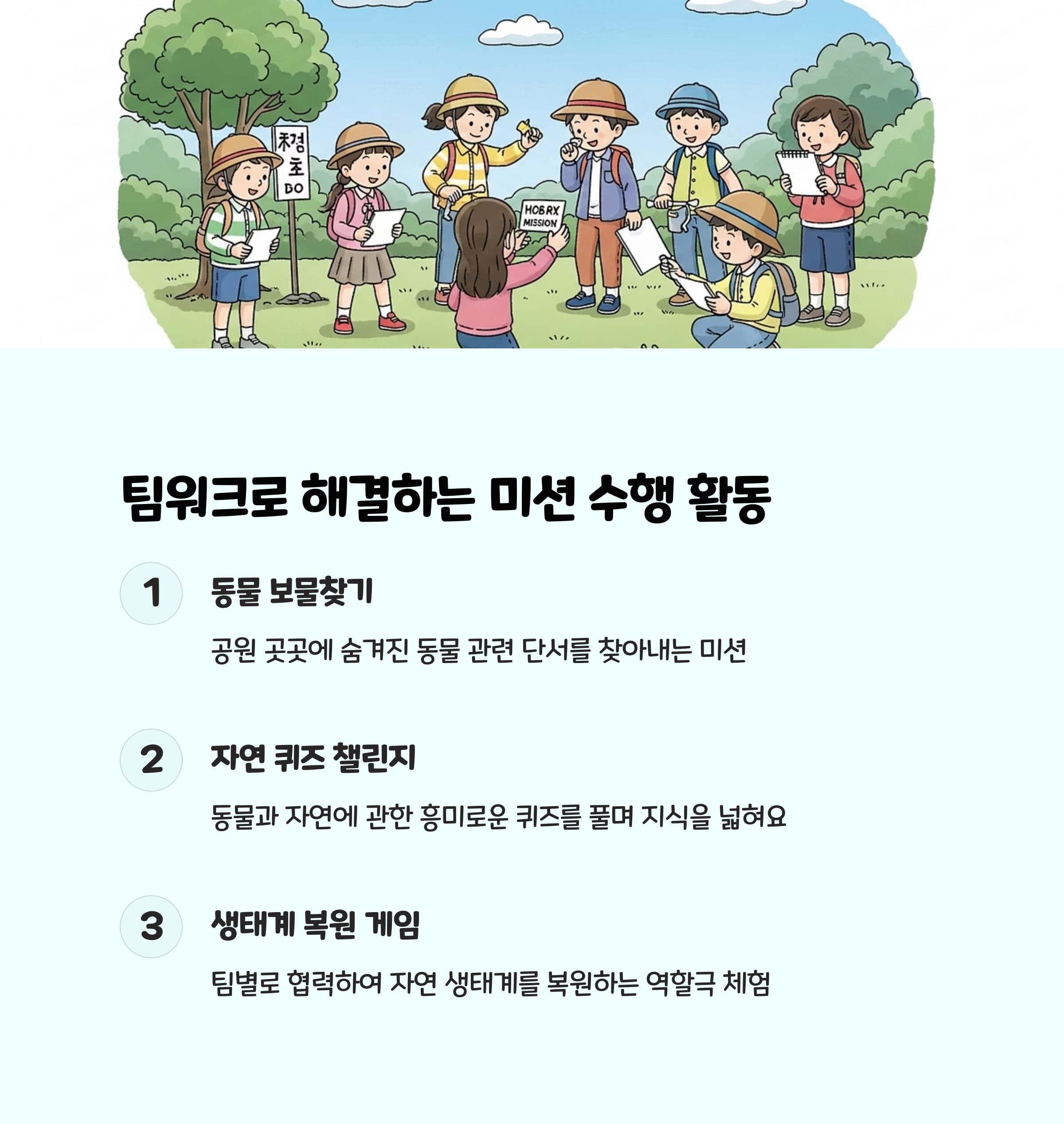 • 미션형 동물 탐험대: 동물원의 비밀 장소를 찾아 미션 완수(초등 저학년)