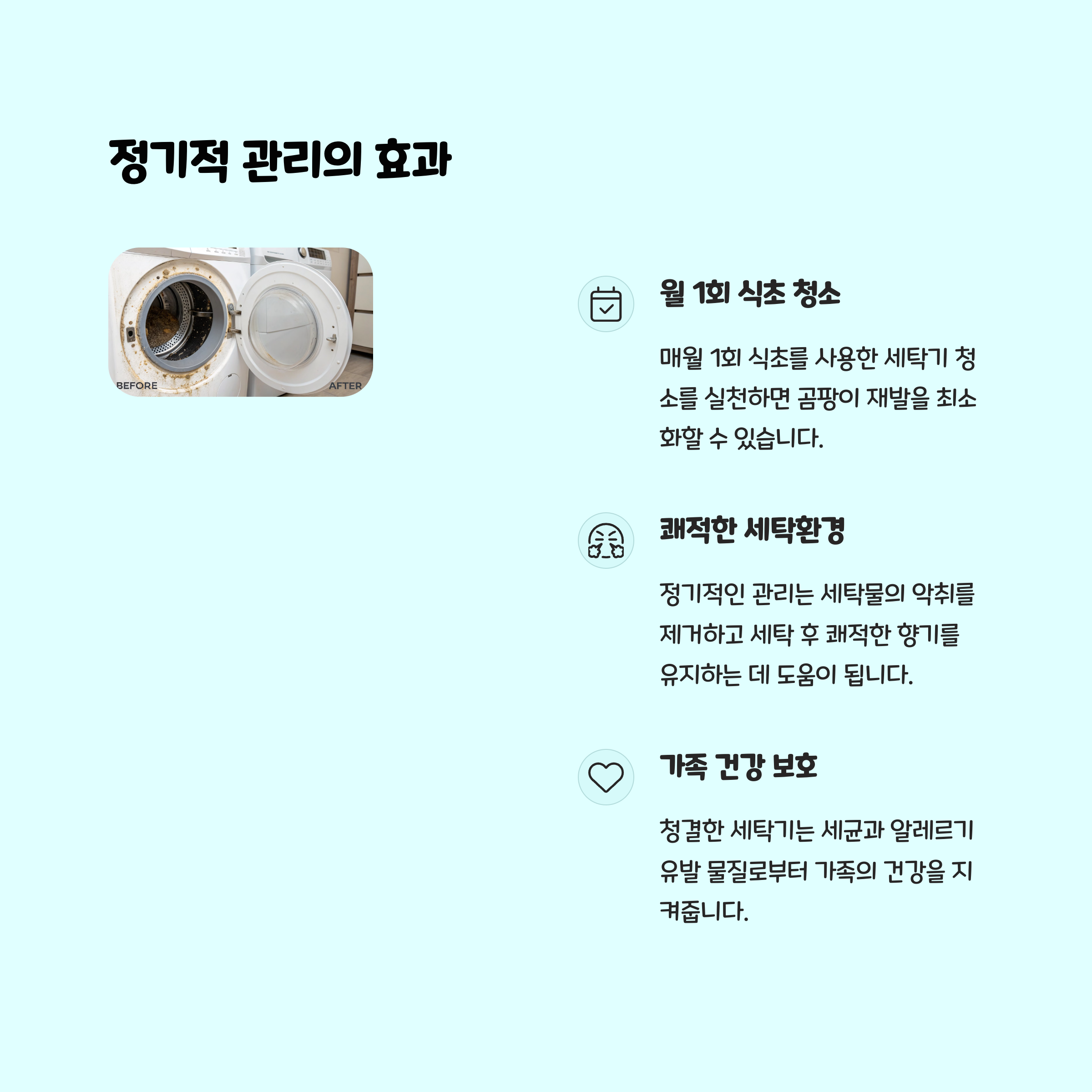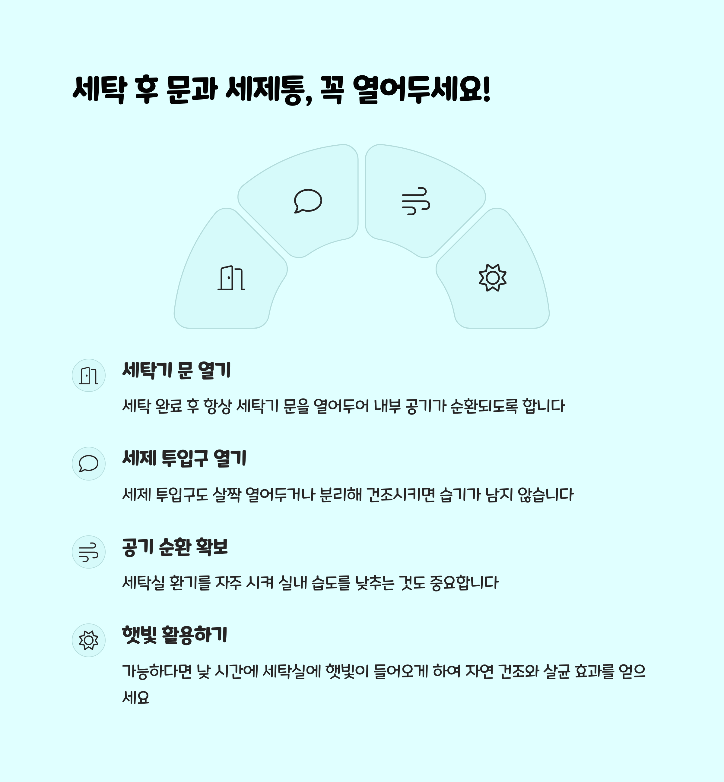 - 세탁 후 항상 문을 열어두어 공기가 순환되도록 합니다.