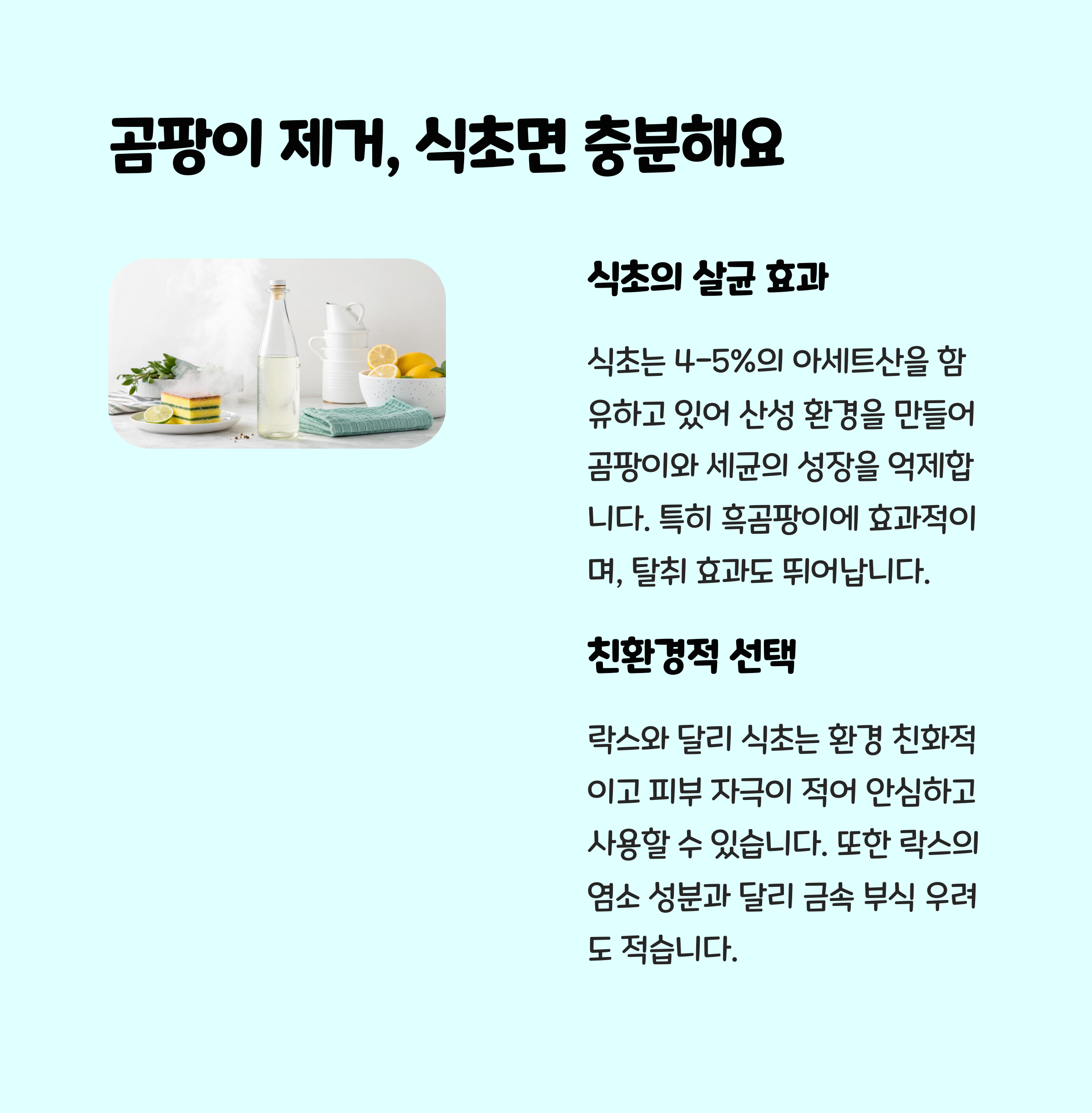 - 마무리 : 부드러운 천으로 깨끗하게 닦아내고, 물기로 인해 다시 곰팡이가 생기지 않도록 완전히 건조시킵니다.