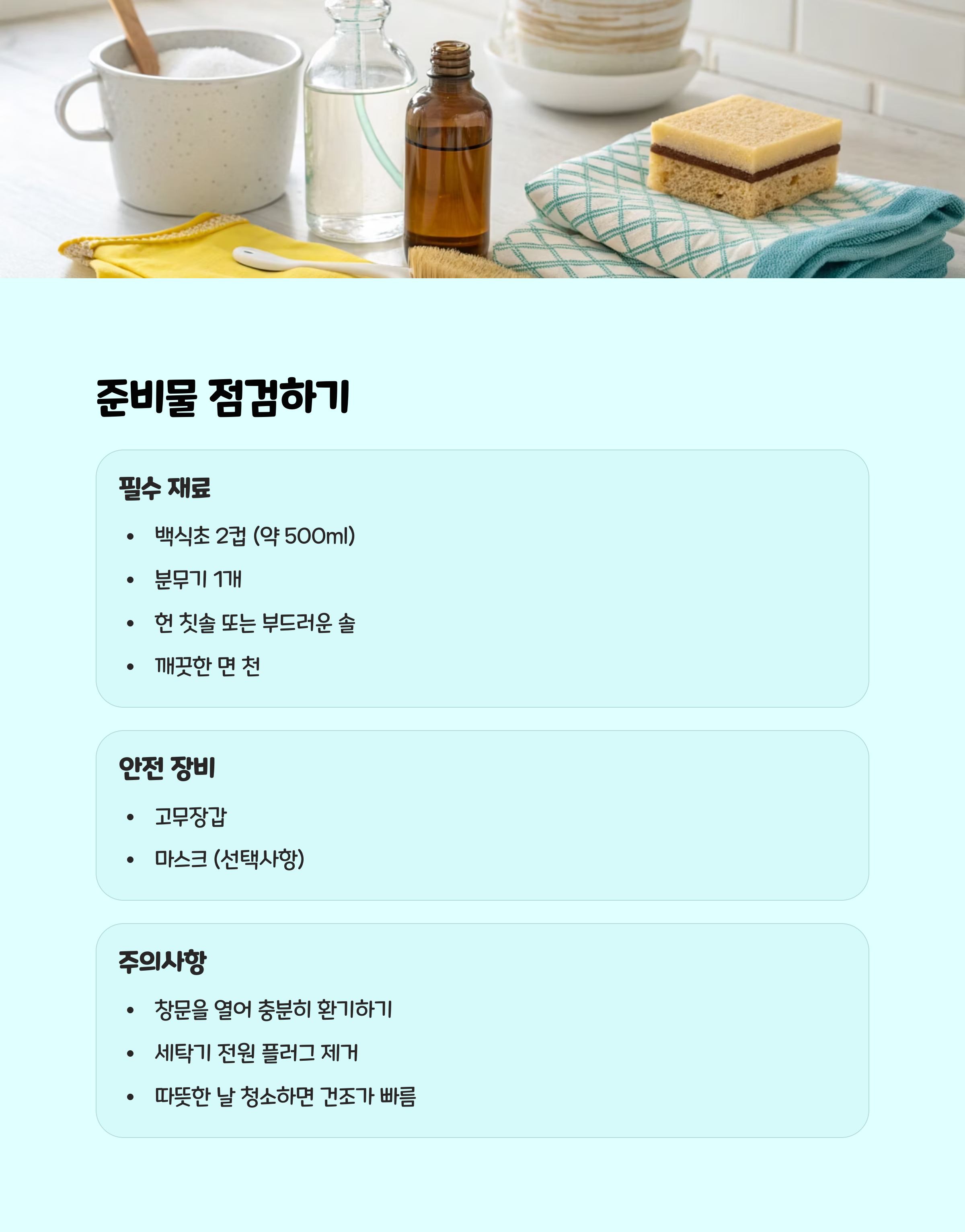 - 식초 활용 : 백식초 2컵을 세탁기에 넣고 가장 높은 온도로 일반 세탁 코스를 실행합니다. 식초는 천연 항균 및 항곰팡이 성분이 있어 내부의 곰팡이와 세균을 효과적으로 제거합니다.