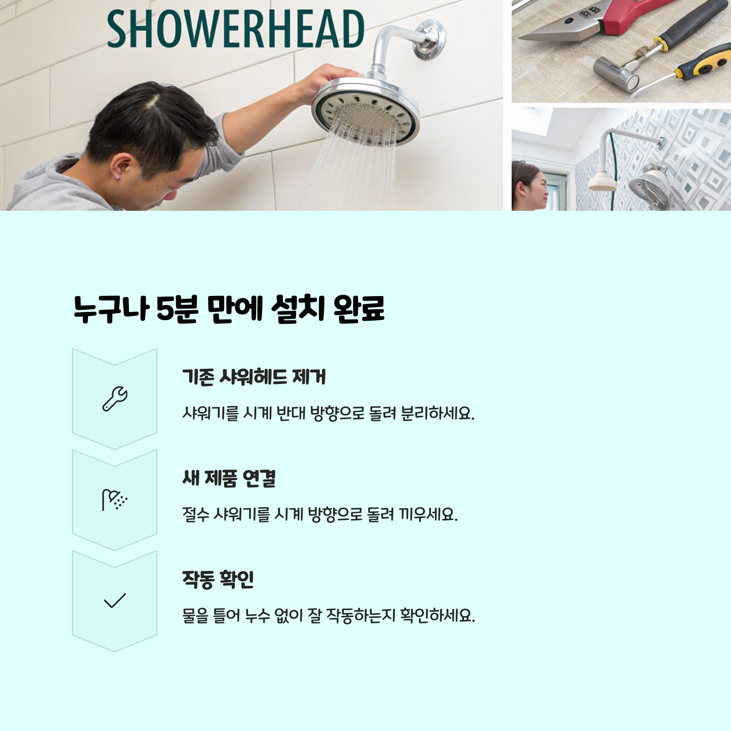 절수 샤워기 설치는 매우 간단합니다. 기존 샤워기를 돌려 빼고 새로운 제품을 돌려 끼우기만 하면 됩니다. 특별한 도구나 기술이 필요 없으며, 약 5분 정도면 충분히 완료할 수 있습니다.