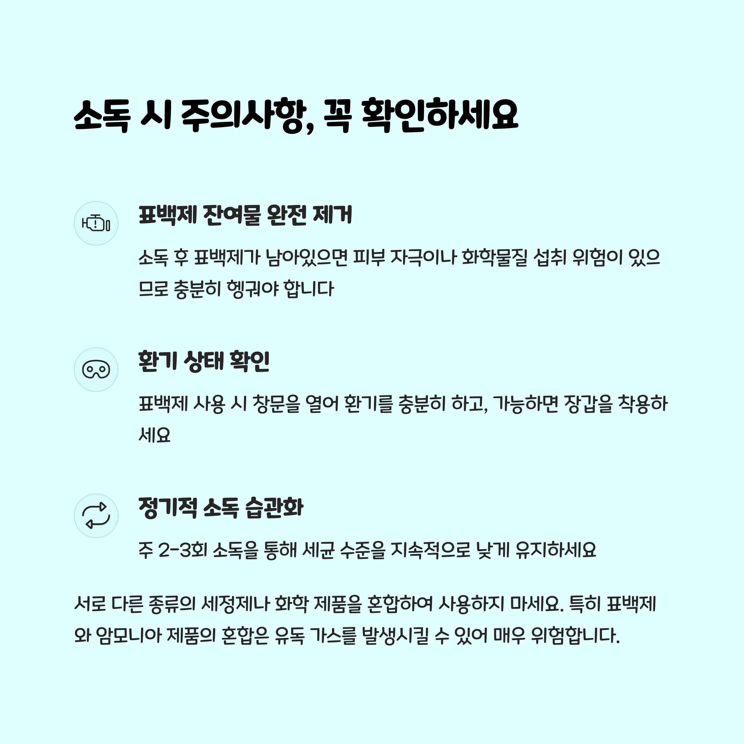 - 표백제 소독법 : 물 1컵에 표백제 3/4컵을 섞어 5분간 담근 뒤 깨끗이 헹궈주세요. 이 방법도 세균 제거에 효과적입니다.