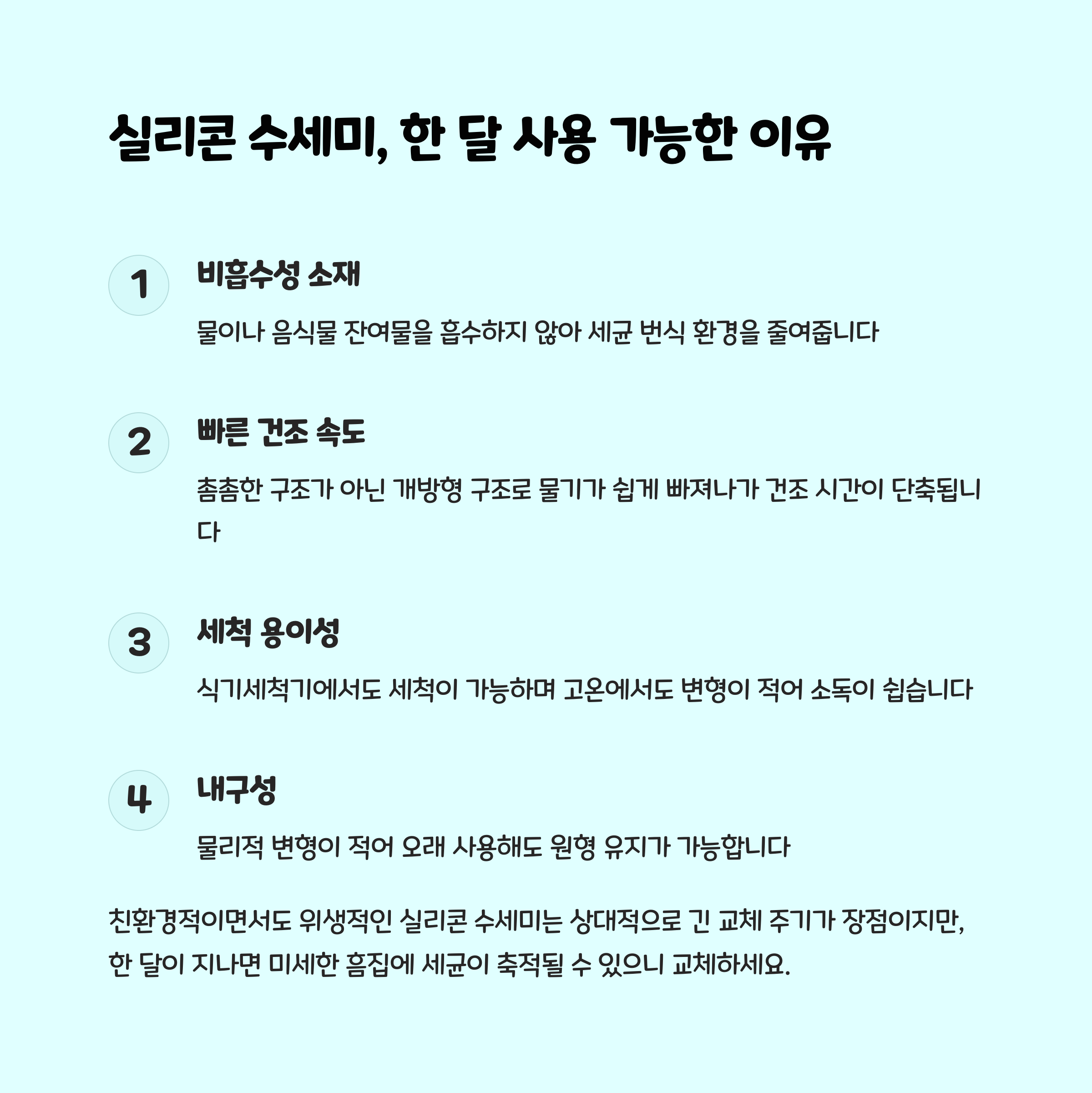 실리콘 수세미는 내구성이 강하고 건조가 빨라 세균 번식이 적지만, 계속 사용하면 미세한 틈에 세균이 쌓일 수 있습니다. 1개월에 한 번은 새것으로 교체하는 것이 위생상 안전합니다. 사용 후에는 깨끗이 씻고 완전히 건조시켜 사용하세요.