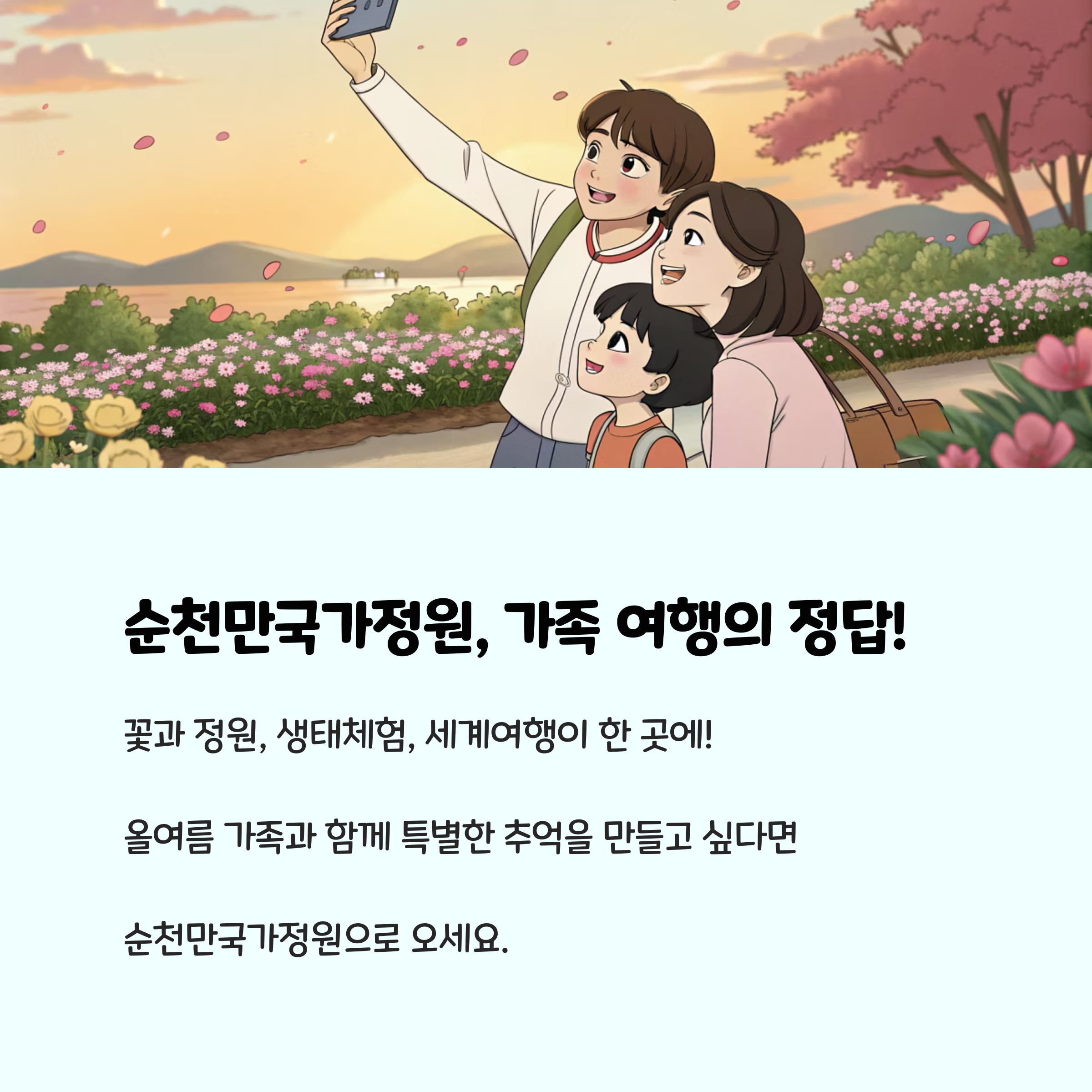 순천만 국가정원은 여름꽃의 절정과 다양한 체험, 그리고 어디서나 인생샷을 남길 수 있는 명소가 가득한 국내 최고의 가족여행지입니다. 여름방학, 주말 나들이, 특별한 추억을 남기고 싶은 가족이라면 지금이 가장 좋은 시기입니다. 여러분의 고민을 단번에 해결해 줄 순천만 국가정원에서, 자연과 예술, 그리고 가족의 소중한 순간을 사진으로 남겨보세요!