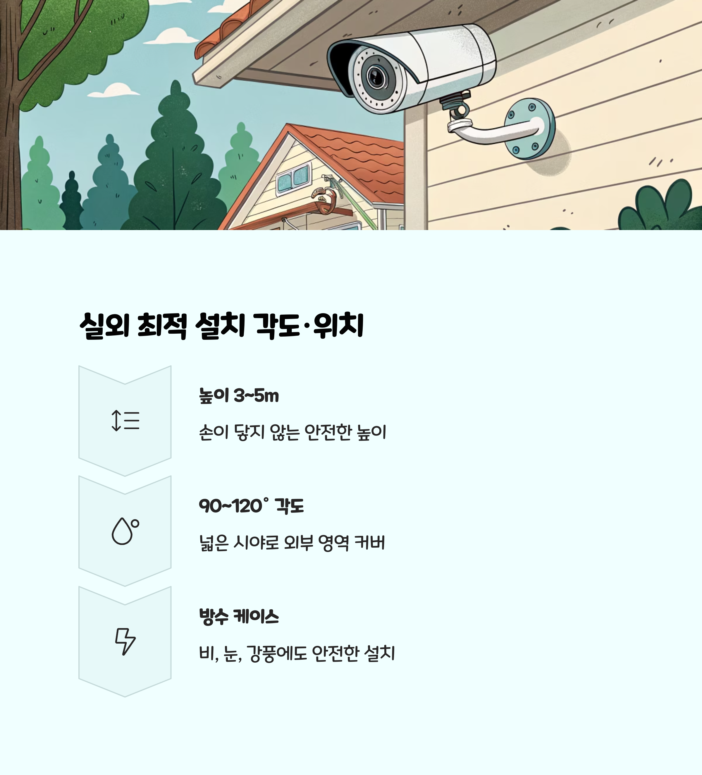 실외 카메라는 약 3~5m 높이에 설치하면 사각지대가 최소화되고, 감시하려는 공간을 중심으로 90~120도 각도로 조정하면 넓은 시야를 확보할 수 있습니다. 또한, 햇빛이나 조명의 영향을 덜 받는 위치를 선택해야 영상 품질이 떨어지지 않습니다. 역광이 발생할 경우 영상이 어두워지거나 왜곡될 수 있으니 각도를 조정해 주세요.