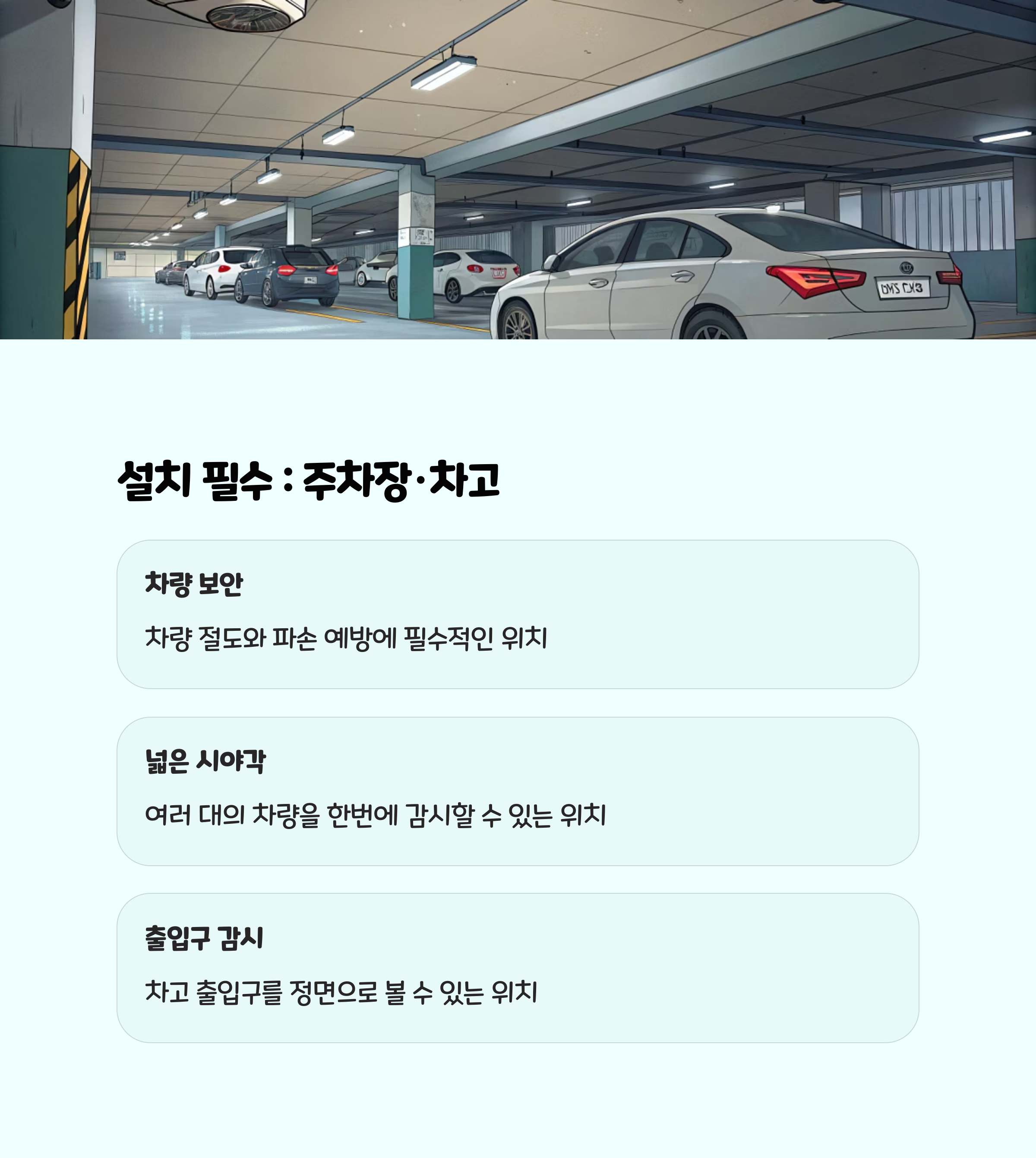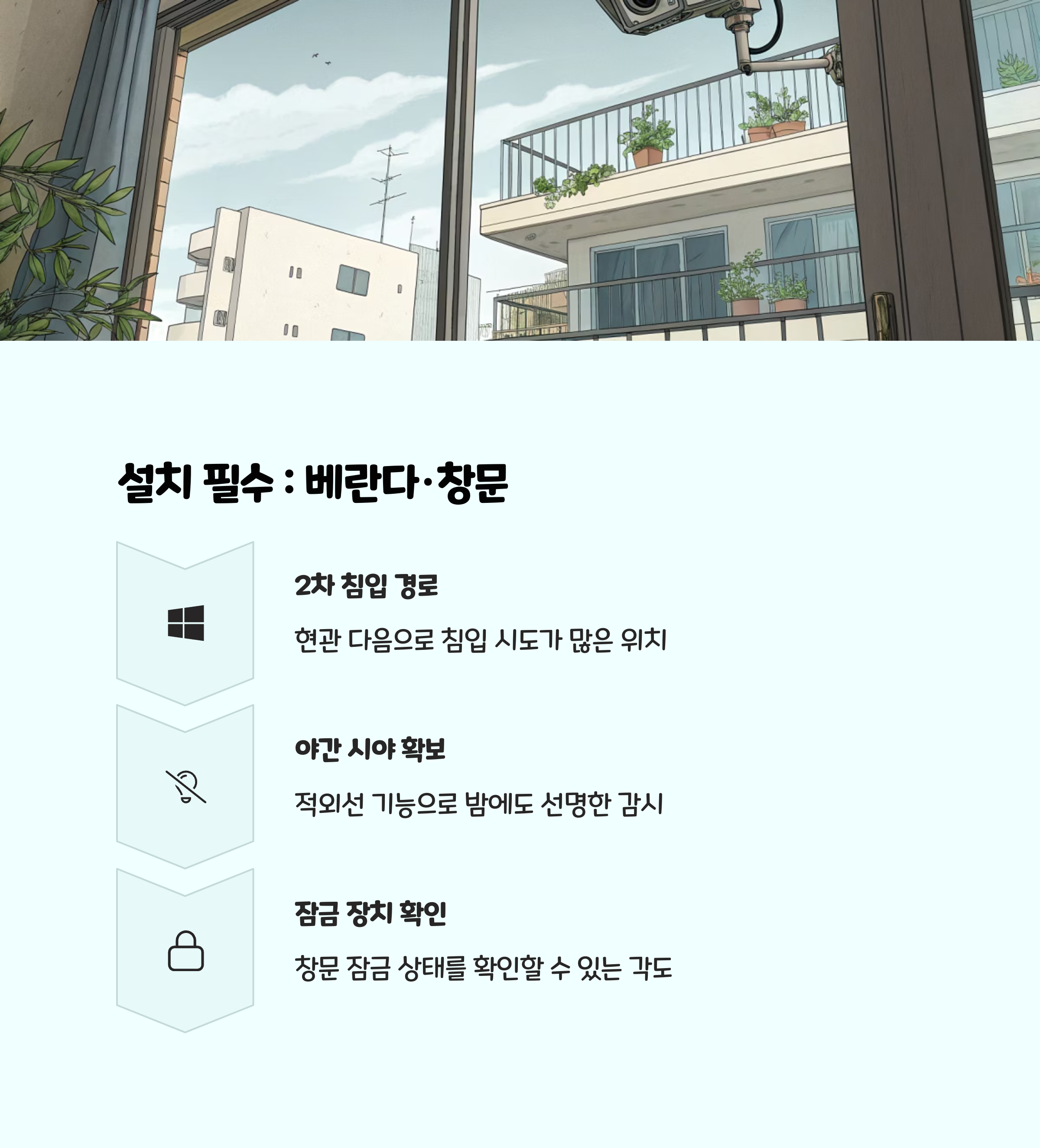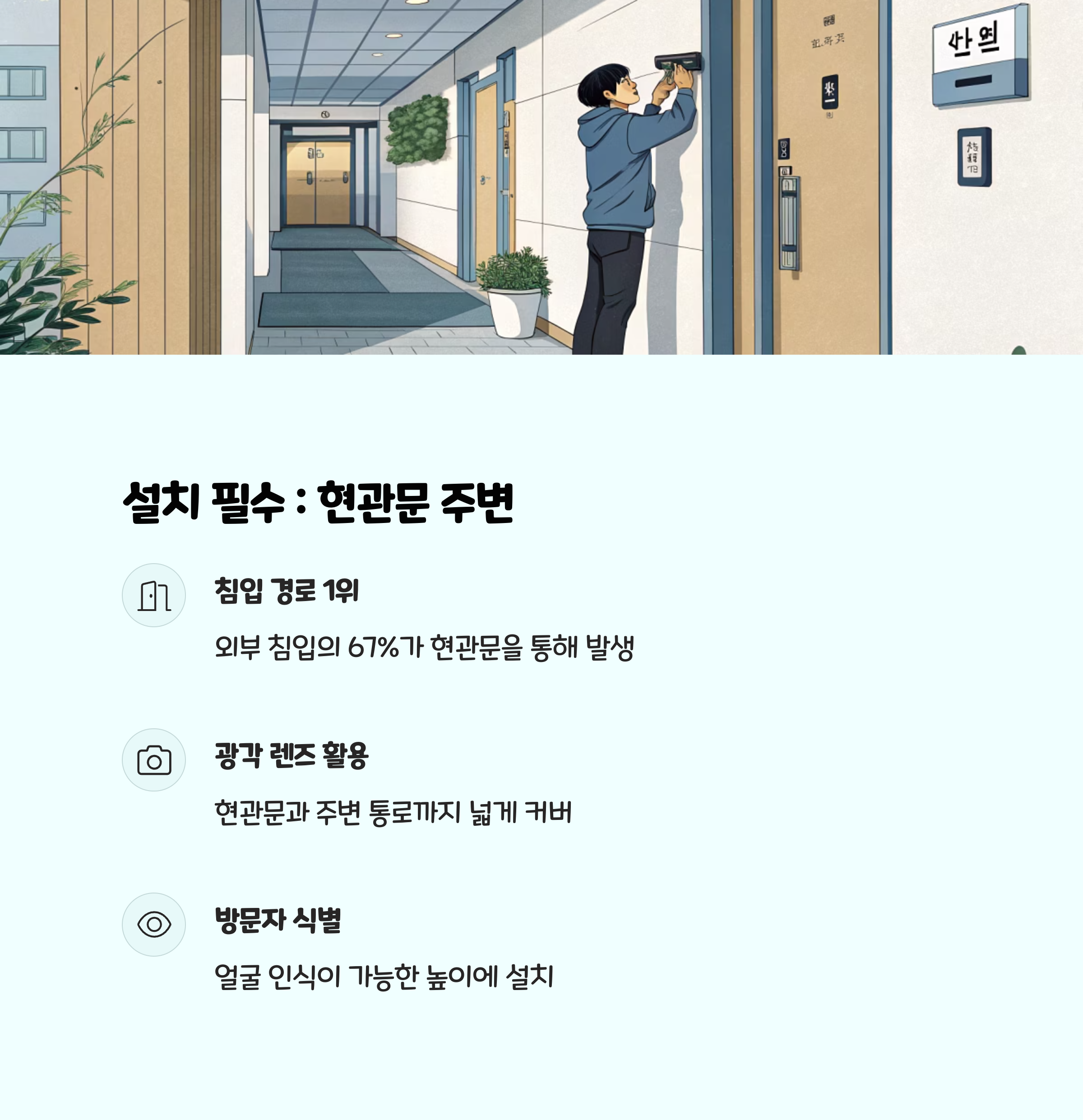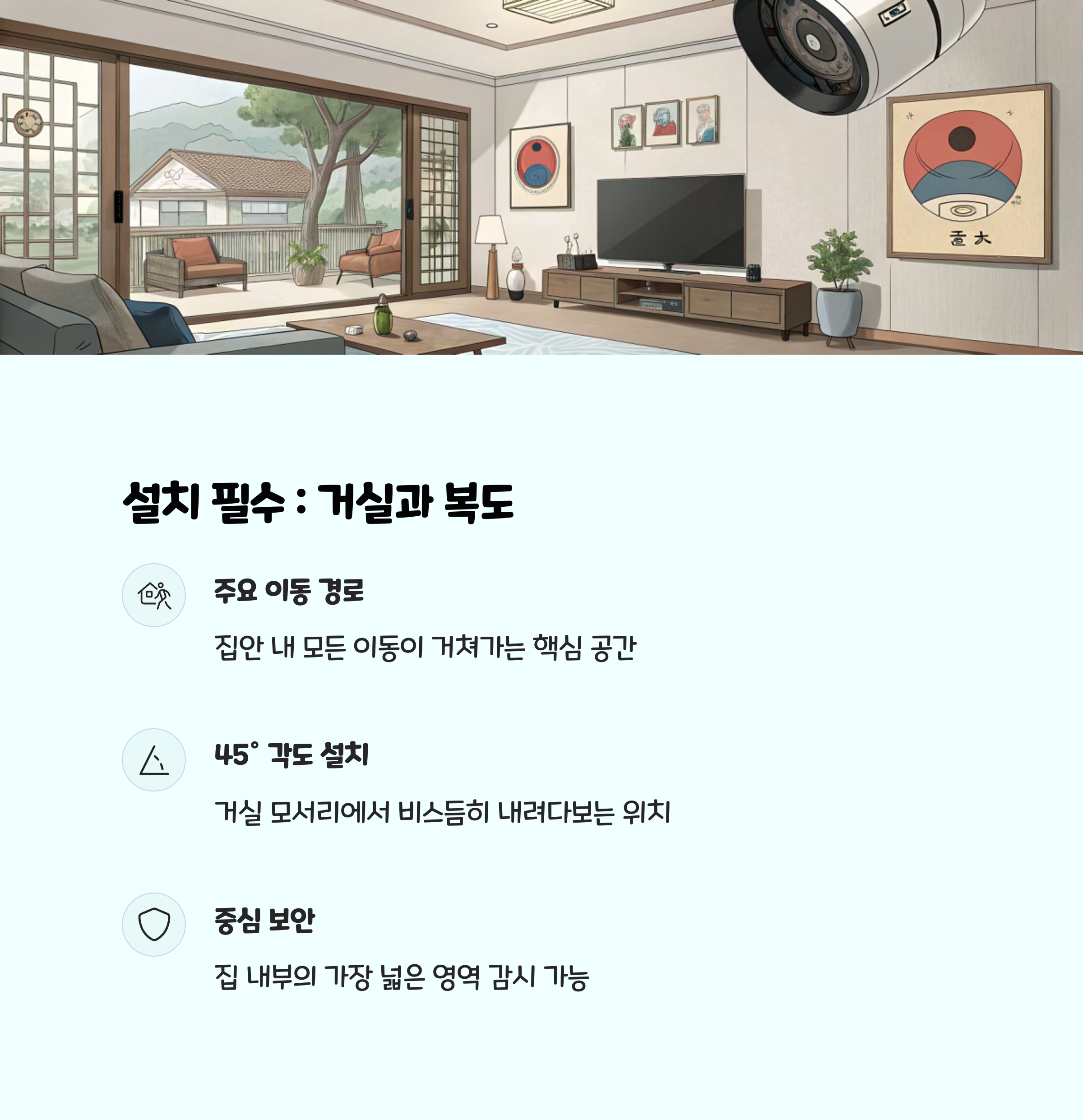 현관, 출입구, 거실, 베란다, 주차장 등 집안 주요 동선과 외부 접근 경로가 가장 중요합니다. 이곳에 설치하면 침입과 사고를 빠르게 감지할 수 있어 안전성이 크게 높아집니다. 특히 현관은 외부인의 출입이 가장 잦은 곳으로, 반드시 커버해야 할 핵심 위치입니다.