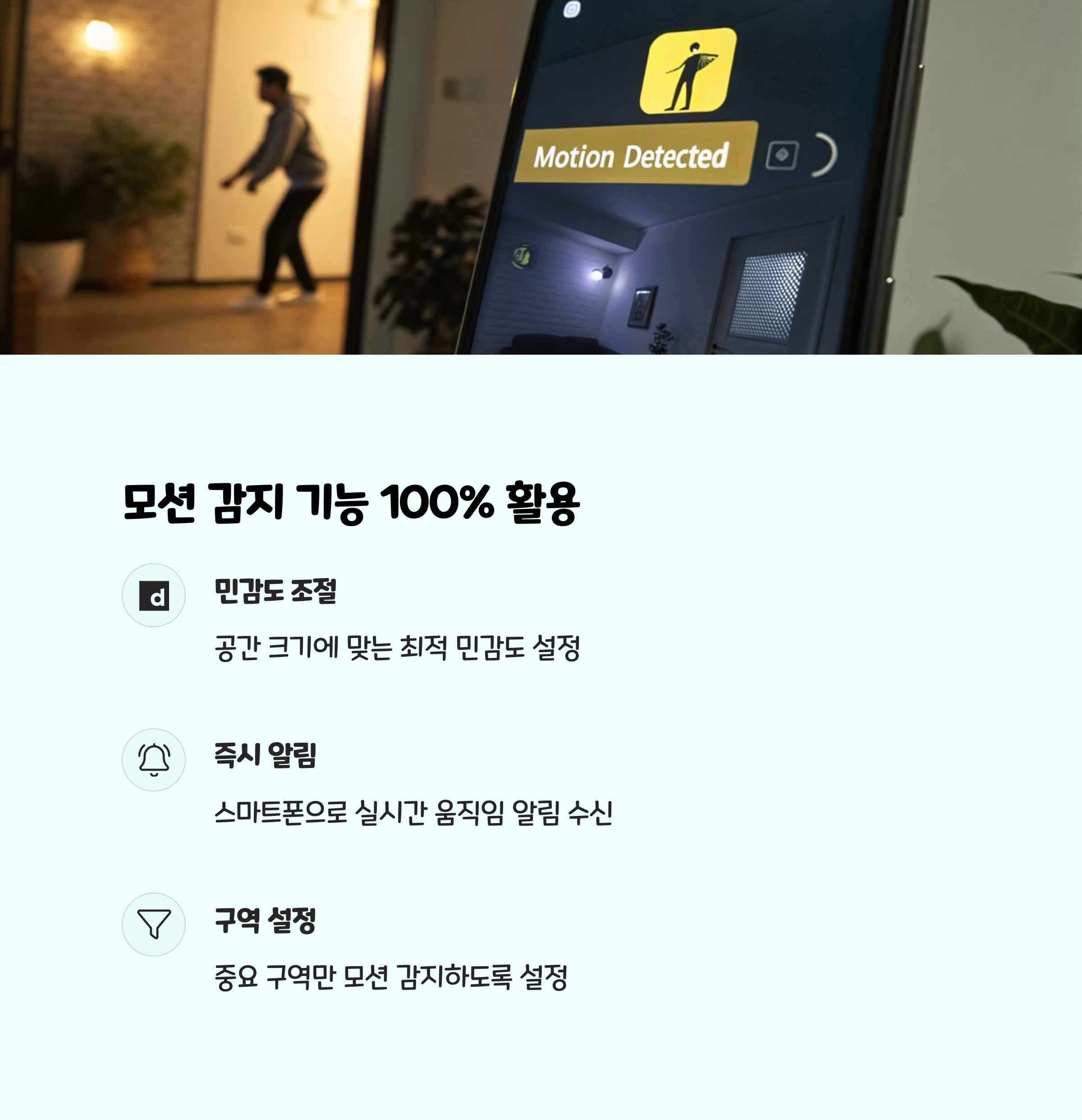 카메라 대수와 위치 조합: 집 구조에 따라 여러 대를 설치해 모든 동선과 접근 경로를 커버할 수 있습니다.모션 감지 기능 활용: 움직임이 감지될 때만 촬영하거나 알림을 받을 수 있어, 불필요한 영상 저장을 줄이고 중요한 순간을 놓치지 않습니다.AI 기반 얼굴 인식, 동작 감지: 최신 스마트홈 카메라는 AI 기술로 사람과 동물을 구분해 알림을 줍니다. 이를 활용하면 더욱 정교한 보안이 가능합니다.전원 및 네트워크 환경: 무선 카메라라도 배터리 관리나 충전이 필요하니, 전원 공급이 용이한 위치를 선택하세요.프라이버시 존 설정: 침실 등 민감한 공간은 촬영하지 않도록 영역 마스킹 기능을 활용하세요.