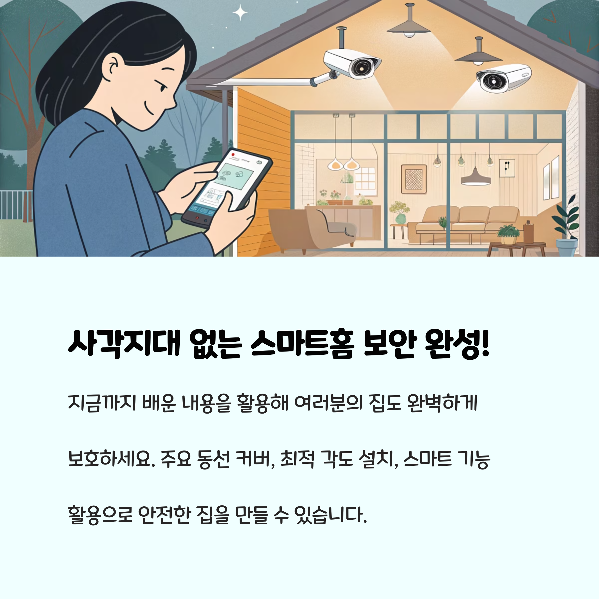 스마트홈 보안카메라 설치에서 가장 중요한 것은 사각지대를 최소화하는 위치 선정과 실내외 활용 목적에 맞는 설치입니다. 출입구, 거실, 베란다, 주차장 등 주요 동선을 커버하고, 카메라 대수와 위치 조합, 각도, 높이, 조명 환경까지 신경 써서 설치하면 보안 효과가 극대화됩니다. 또한, 최신 AI 기능과 모션 감지, 앱 연동, 클라우드 저장 등 다양한 스마트 기능을 적극 활용하면 더욱 안심하고 집을 지킬 수 있습니다.