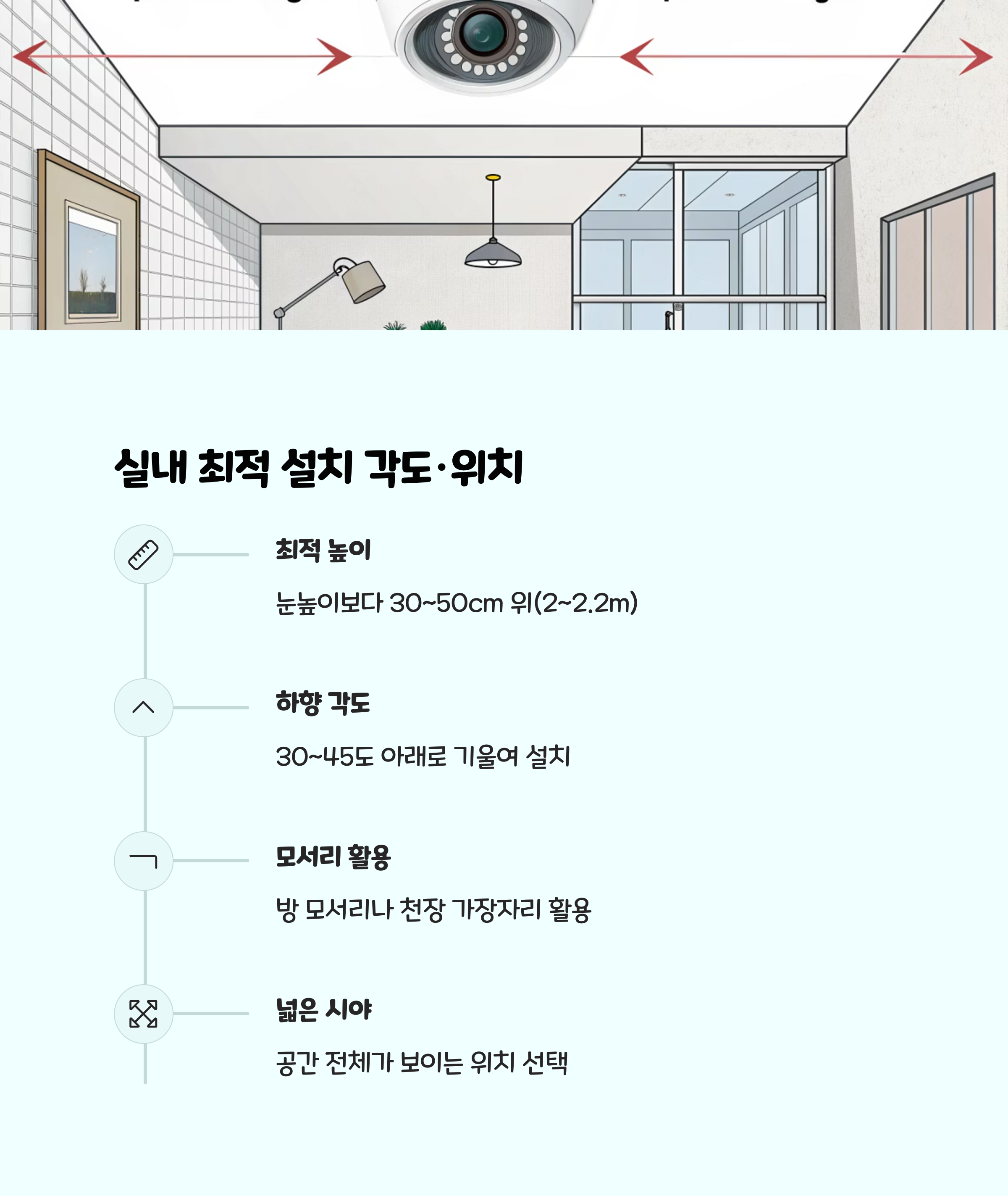 카메라 설치 각도는 눈높이보다 약간 위에서 비스듬히 내려다보는 각도가 가장 이상적입니다. 이렇게 하면 얼굴 식별이 용이하고, 감시 범위가 넓어집니다.