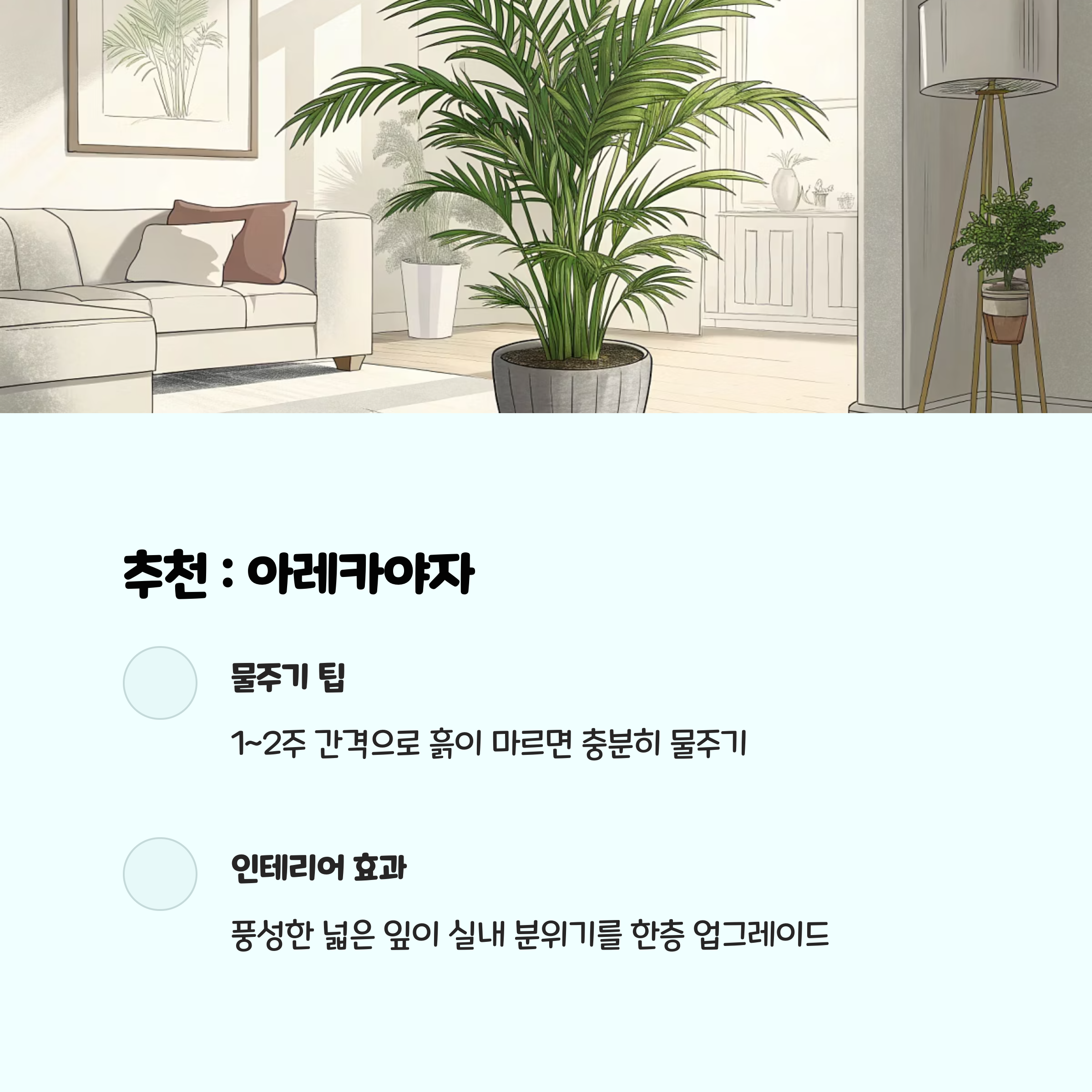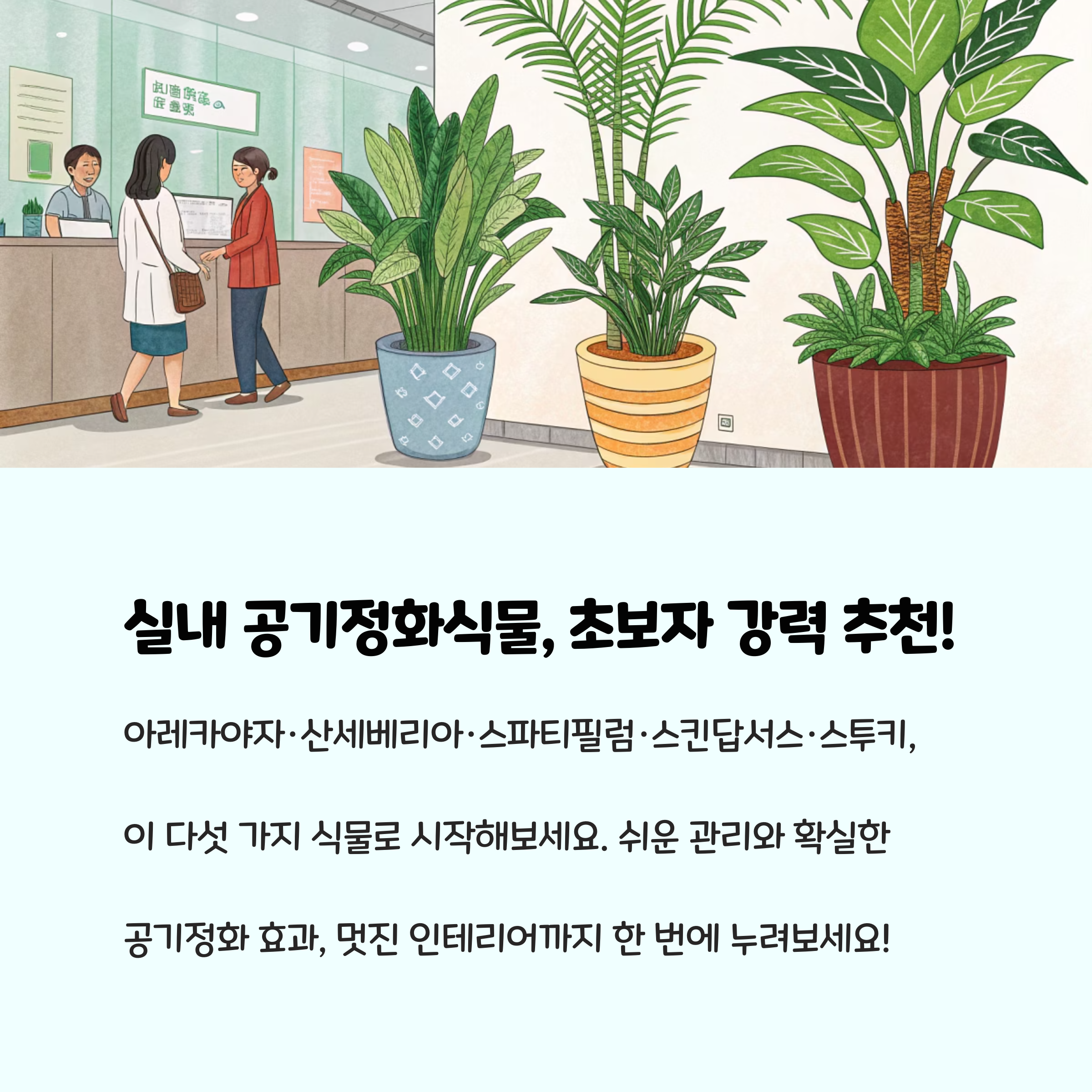 식물 키우기가 어렵게만 느껴졌다면, 오늘 소개한 아레카야자, 산세베리아, 스파티필럼, 스킨답서스, 스투키부터 시작해보세요. 이 식물들은 강한 생명력과 쉬운 관리, 뛰어난 공기정화 효과로 실내 환경을 쾌적하게 만들어주며, 초록 식물이 주는 심리적 안정감과 인테리어 효과도 함께 누릴 수 있습니다.