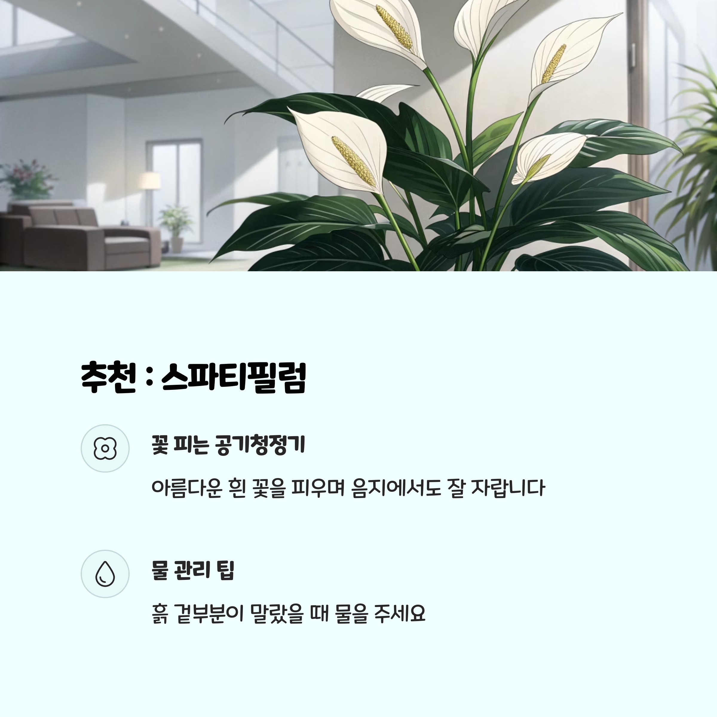 - 잎 관리 : 주기적으로 잎을 닦아주면 공기정화 효과가 높아집니다.
