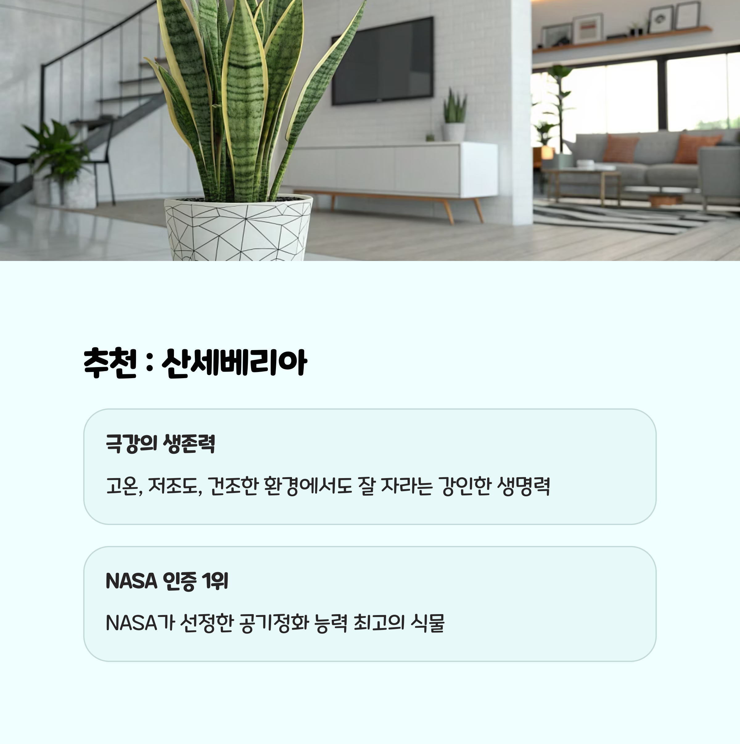 산세베리아는 한 달간 물을 주지 않아도 살 수 있을 만큼 강한 생명력을 자랑합니다. 밤에도 산소를 내뿜고, 벤젠, 포름알데히드, 자일렌 등 다양한 유해물질을 제거합니다. NASA 연구에서도 공기정화 효과가 뛰어난 것으로 입증되었습니다.