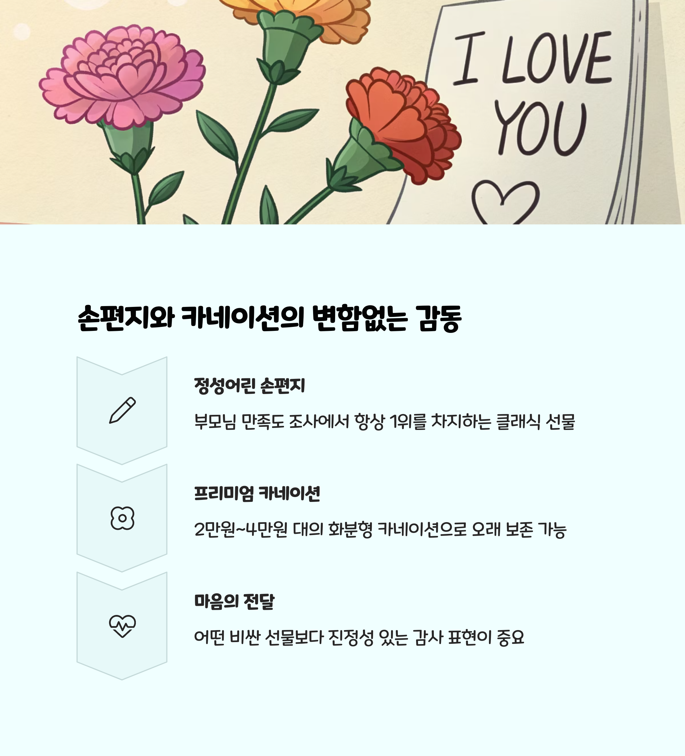 가장 중요한 것은 마음이 담긴 선물입니다. 손편지와 함께 예쁜 카네이션 꽃다발을 준비하면 부모님께 큰 감동을 선사할 수 있습니다. 실제로 2025년 어버이날 온라인 꽃배달 서비스 예약 건수는 작년 대비 22% 증가했습니다. 특히 최근에는 “꽃 돈다발”이 트렌드로, 꽃과 현금을 함께 포장해 드리는 방식이 인기를 끌고 있습니다. 부모님들 사이에서 받은 뒤 메신저 프로필 사진으로 올릴 정도로 만족도가 높습니다.