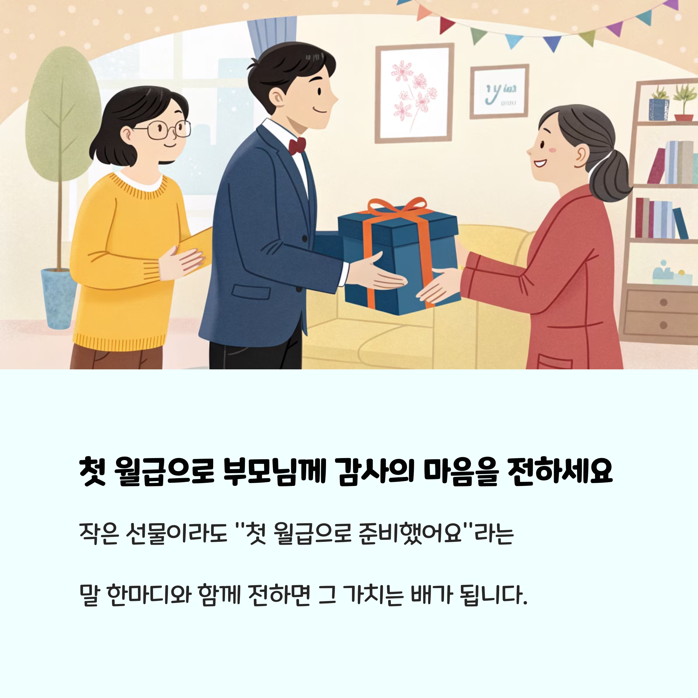 첫 월급으로 부모님께 드릴 선물을 고민하고 있다면, 실용성과 감동, 두 마리 토끼를 모두 잡을 수 있는 건강식품, 생활용품, 감성 선물을 추천합니다. 여기에 진심 어린 손편지 한 장을 더한다면, 그 어떤 고가의 선물보다 오래 기억될 것입니다.