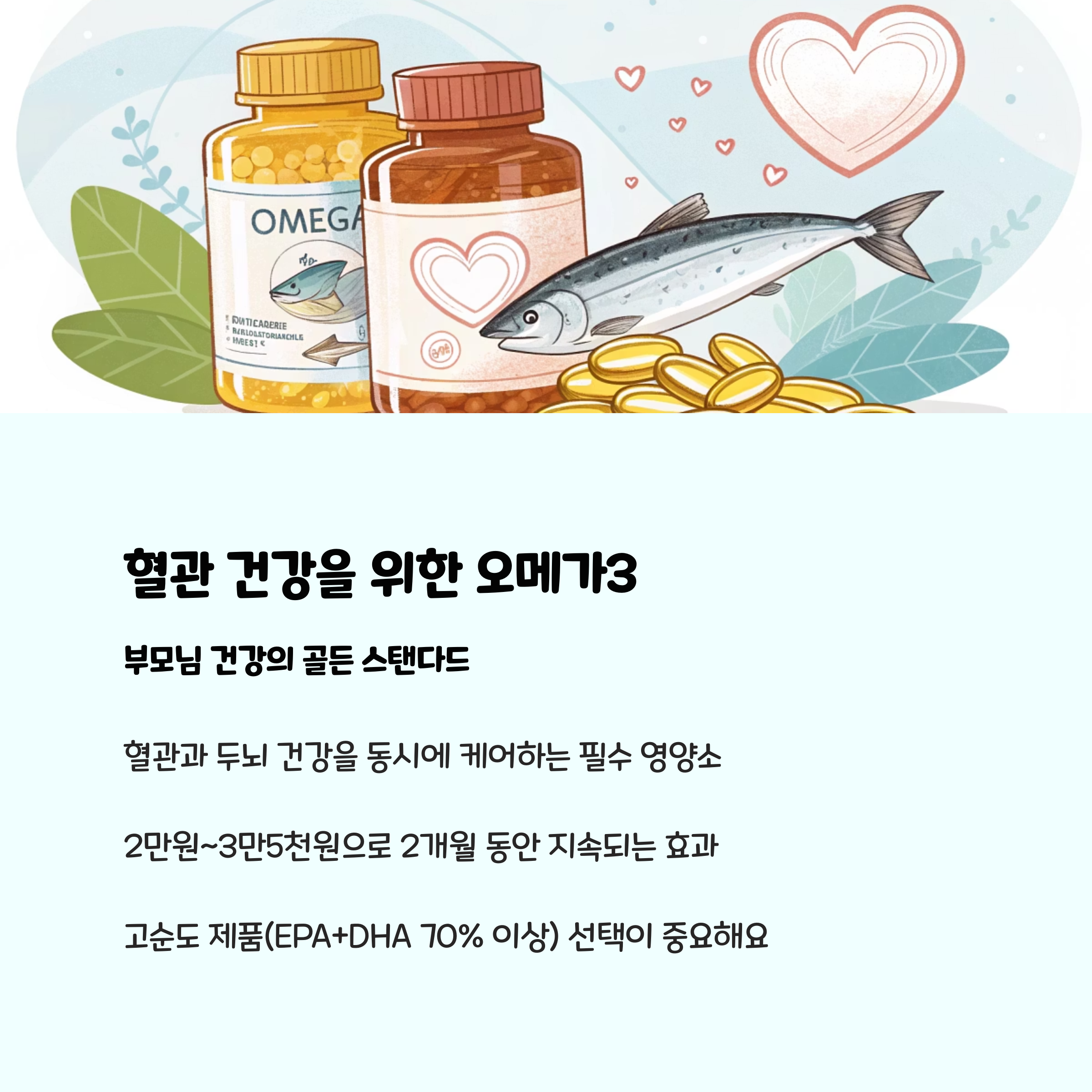 스마트폰, TV 사용이 많은 부모님께는 눈 건강을 위한 루테인, 혈액순환에 좋은 오메가3도 추천합니다. 종근당건강 루테인지아잔틴, 뉴트리코어 오메가3 등은 5만 원대에 구입 가능하며, “부모님이 피로가 덜하다고 하셨다”는 실제 후기가 많습니다.