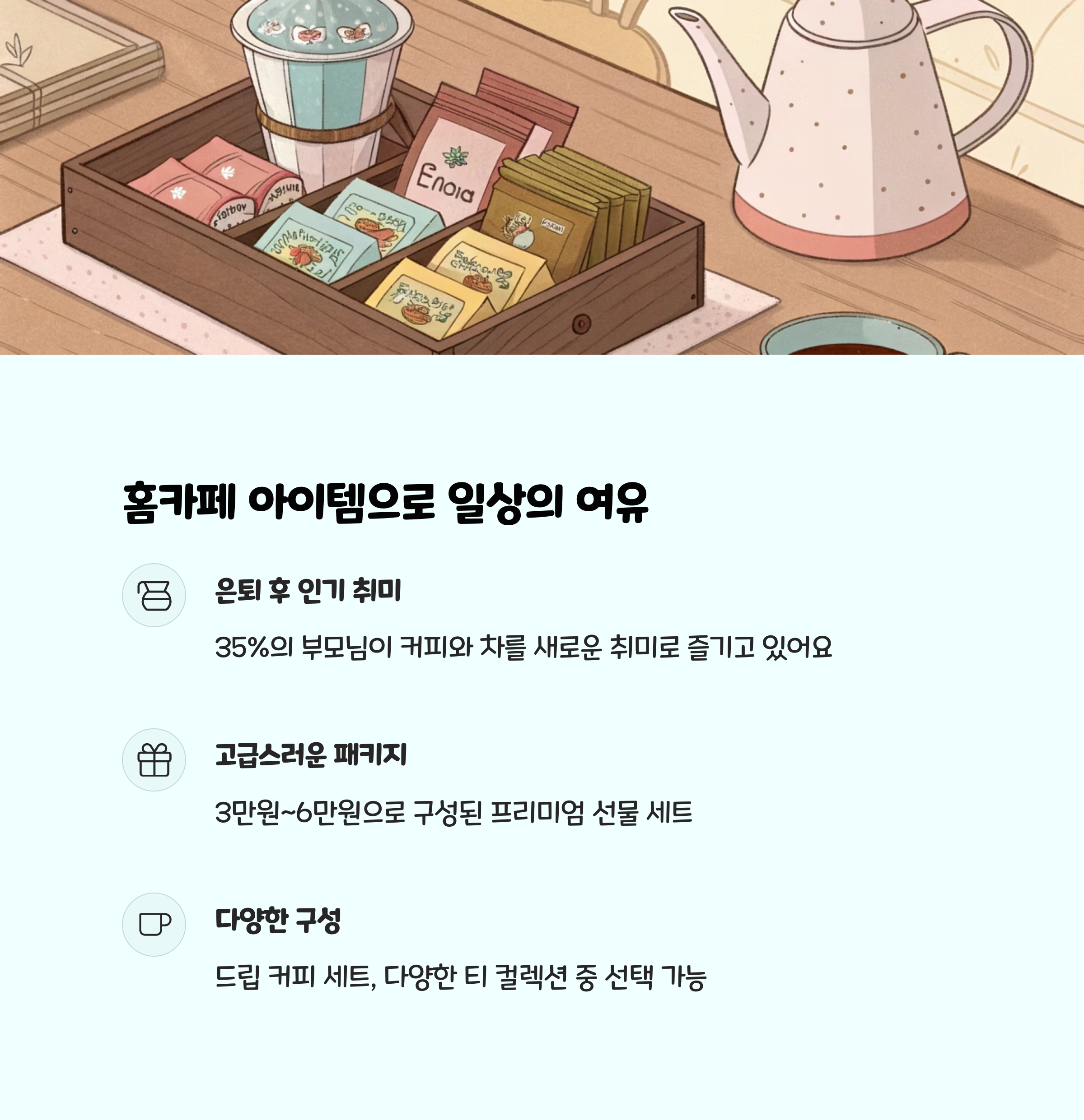 커피나 차를 즐기시는 부모님께는 브레빌 전기포트, 칼디 드립 커피세트, 보덤 프렌치프레스 커피 메이커 등도 추천합니다. “아침마다 커피 내리는 시간이 소확행이 됐다”는 후기가 많으며, 10만 원 이하로 감성적인 선물을 준비할 수 있습니다.