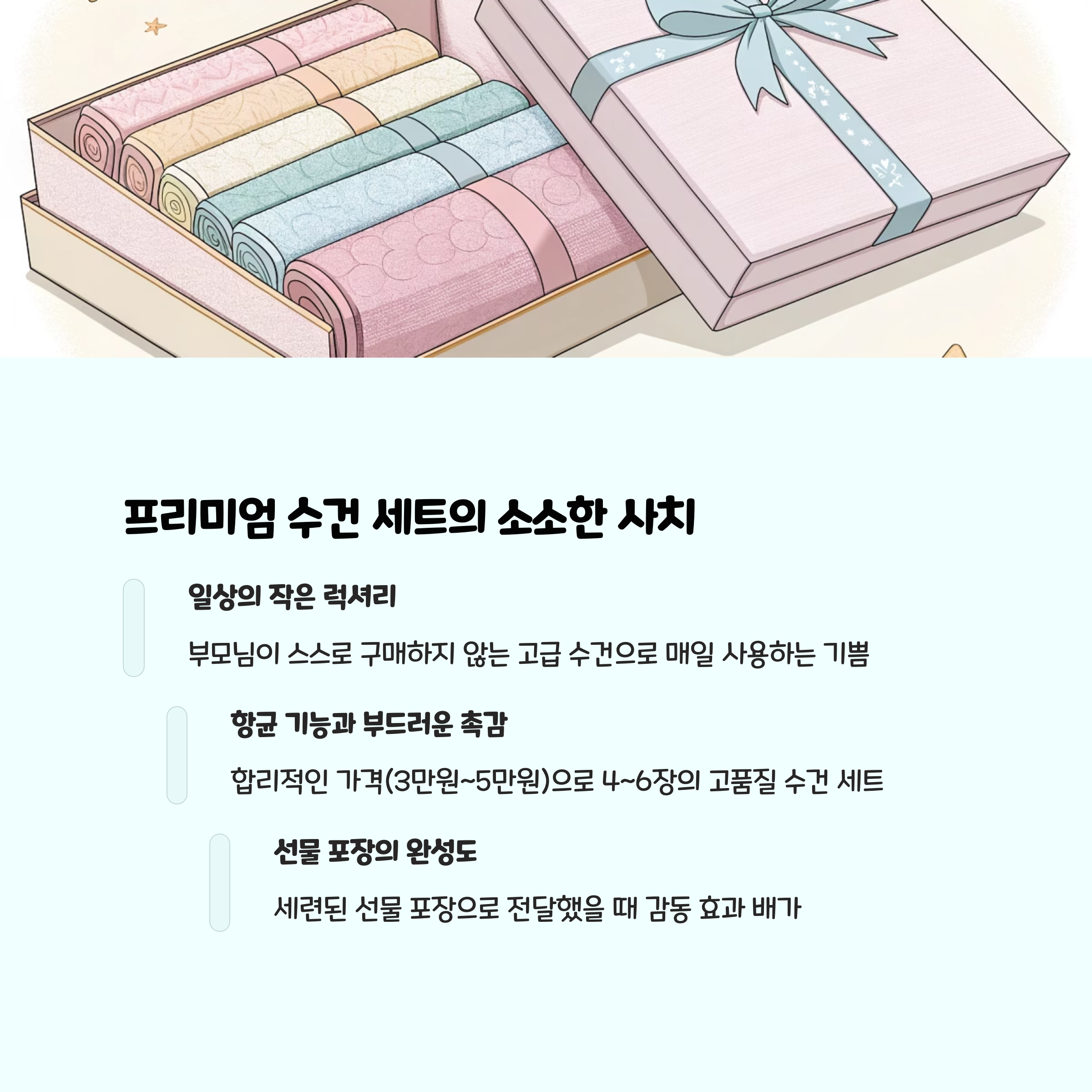 수건은 흔한 듯하지만, 고급 소재와 디자인을 선택하면 부모님이 매일 쓸 때마다 자녀를 떠올릴 수 있는 실용 선물입니다. 최근에는 코토나, 송월타월 등 브랜드 수건 세트가 인기이며, “질 좋은 수건을 선물하니 부모님이 무척 좋아하셨다”는 후기가 많습니다.