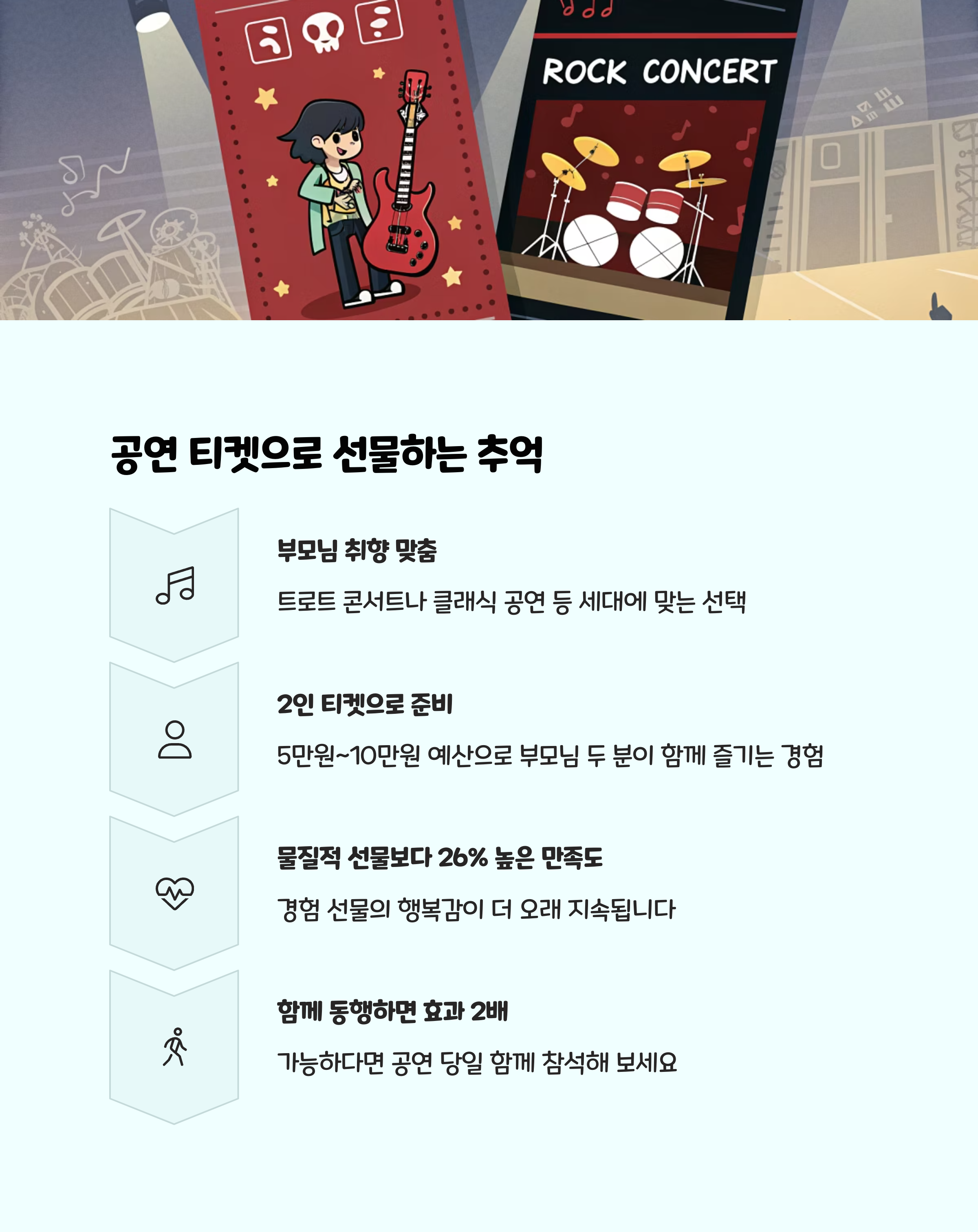 공연, 뮤지컬, 영화 관람권 등도 부모님께 특별한 추억을 선물할 수 있는 방법입니다. 2025년 어버이날 설문조사에서 부모님이 받고 싶은 선물 5위에 ‘공연 티켓’이 올랐을 만큼, 문화생활 선물은 꾸준히 인기입니다.