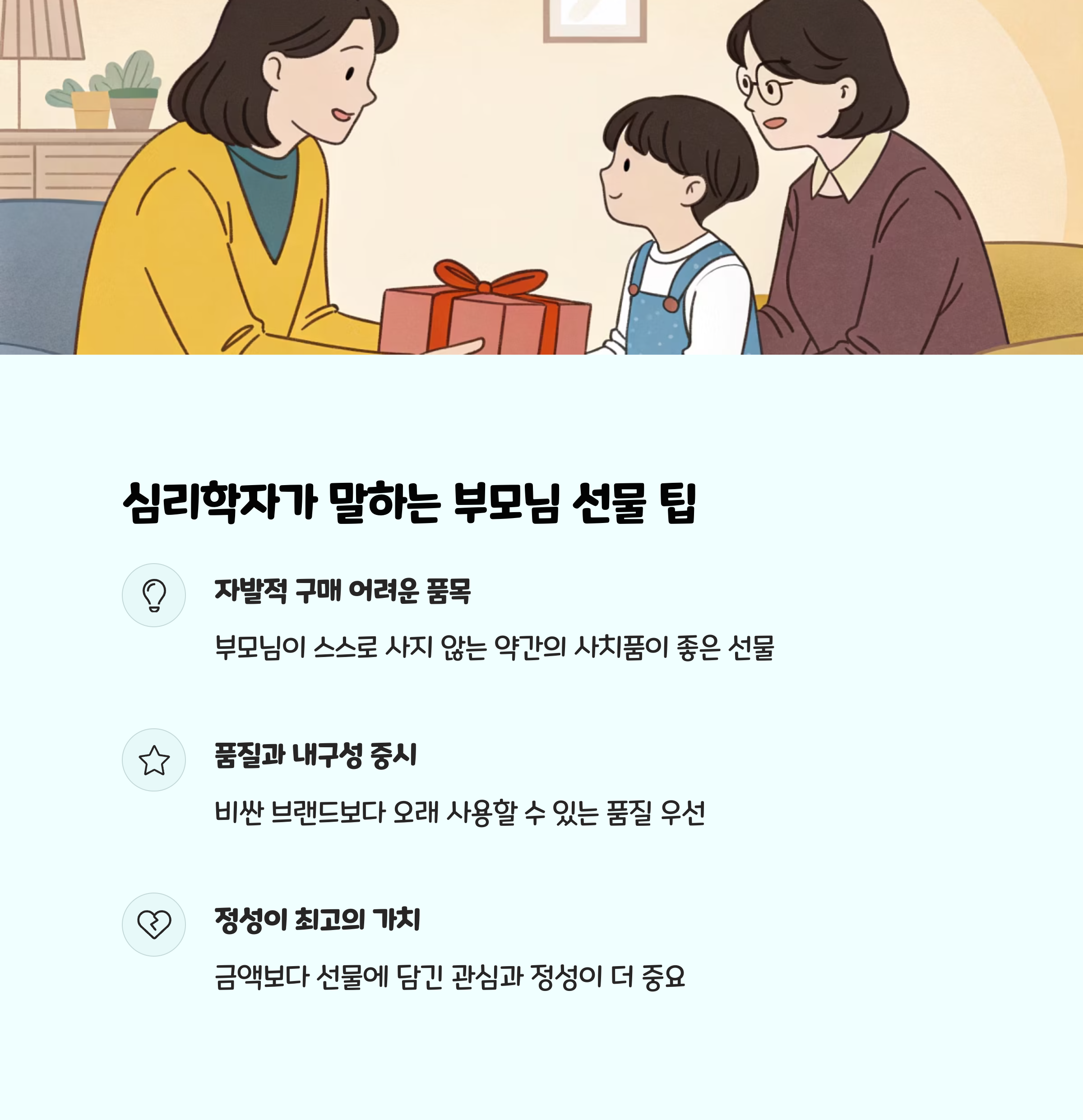 이처럼 10만 원 이하의 선물이라도 부모님께는 큰 기쁨과 감동이 될 수 있습니다. 중요한 것은 가격이 아니라 자녀의 진심과 고민이 담긴 선택이라는 점입니다.