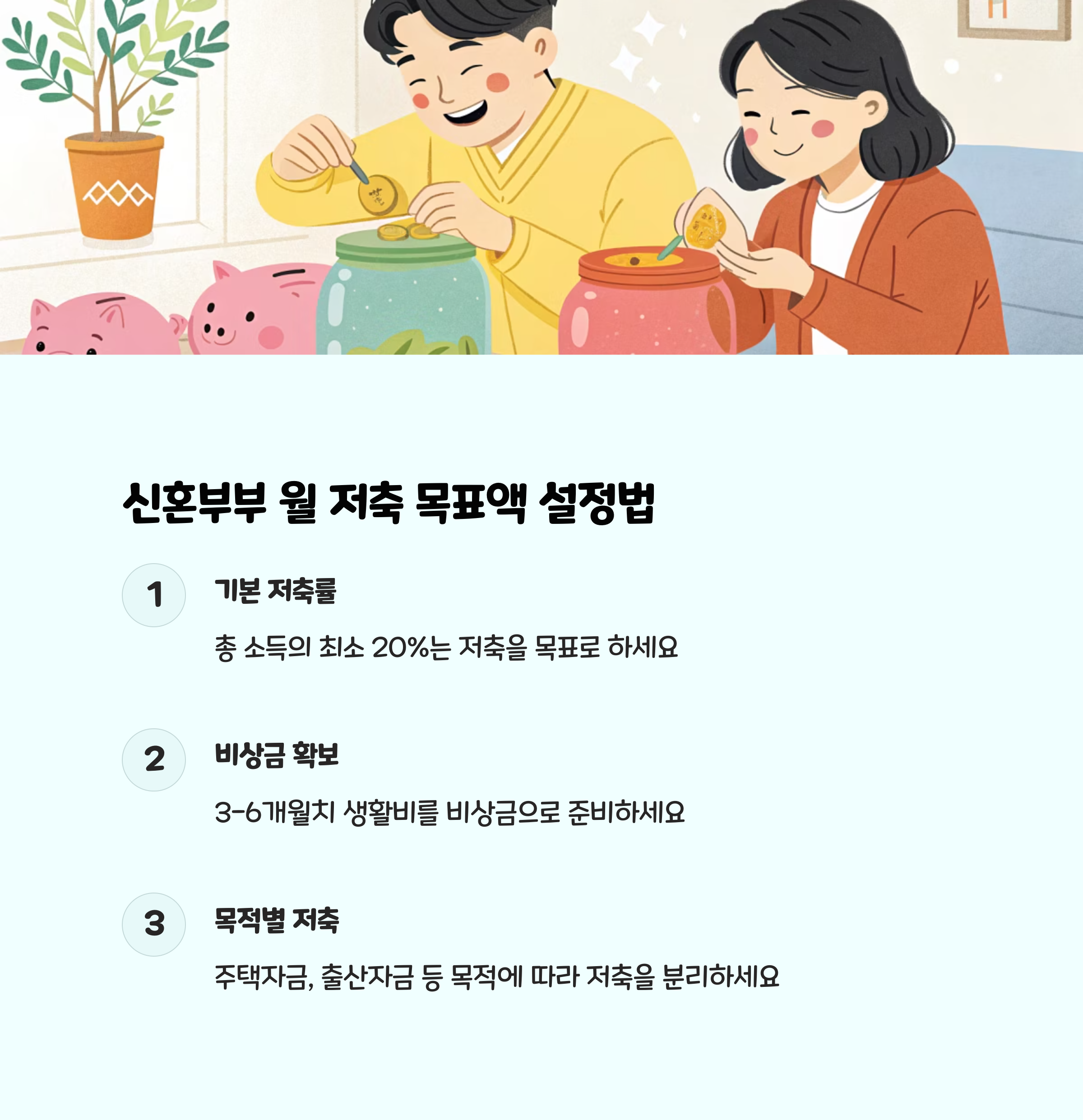- 목표는 구체적으로 : “여행 자금 300만 원 모으기”처럼 구체적인 목표를 세우면 동기부여가 커집니다.