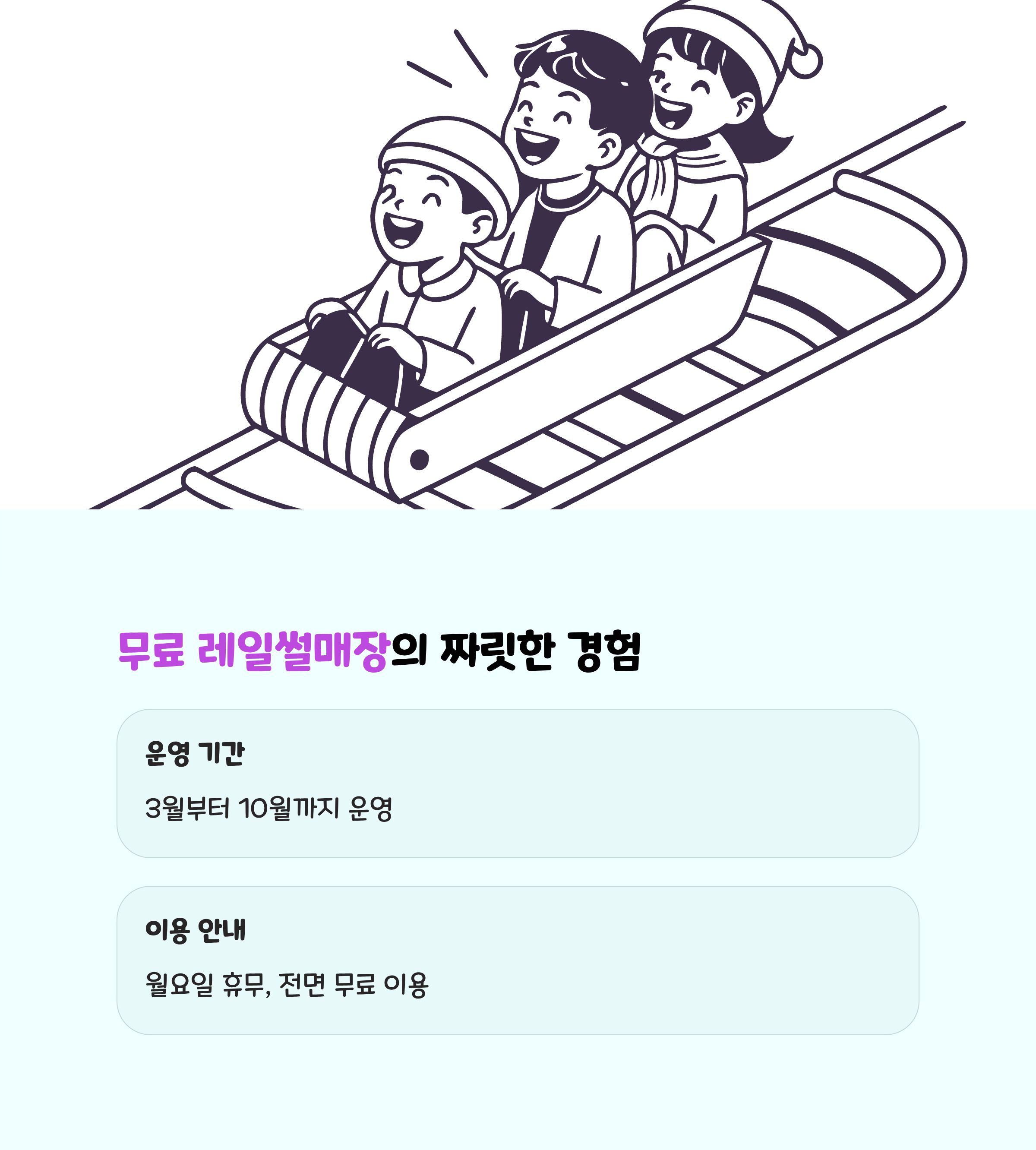 | 레일썰매 운영 | 3~10월, 10:00~17:00, 월요일 휴무, 점심시간 휴식(12~13시) |