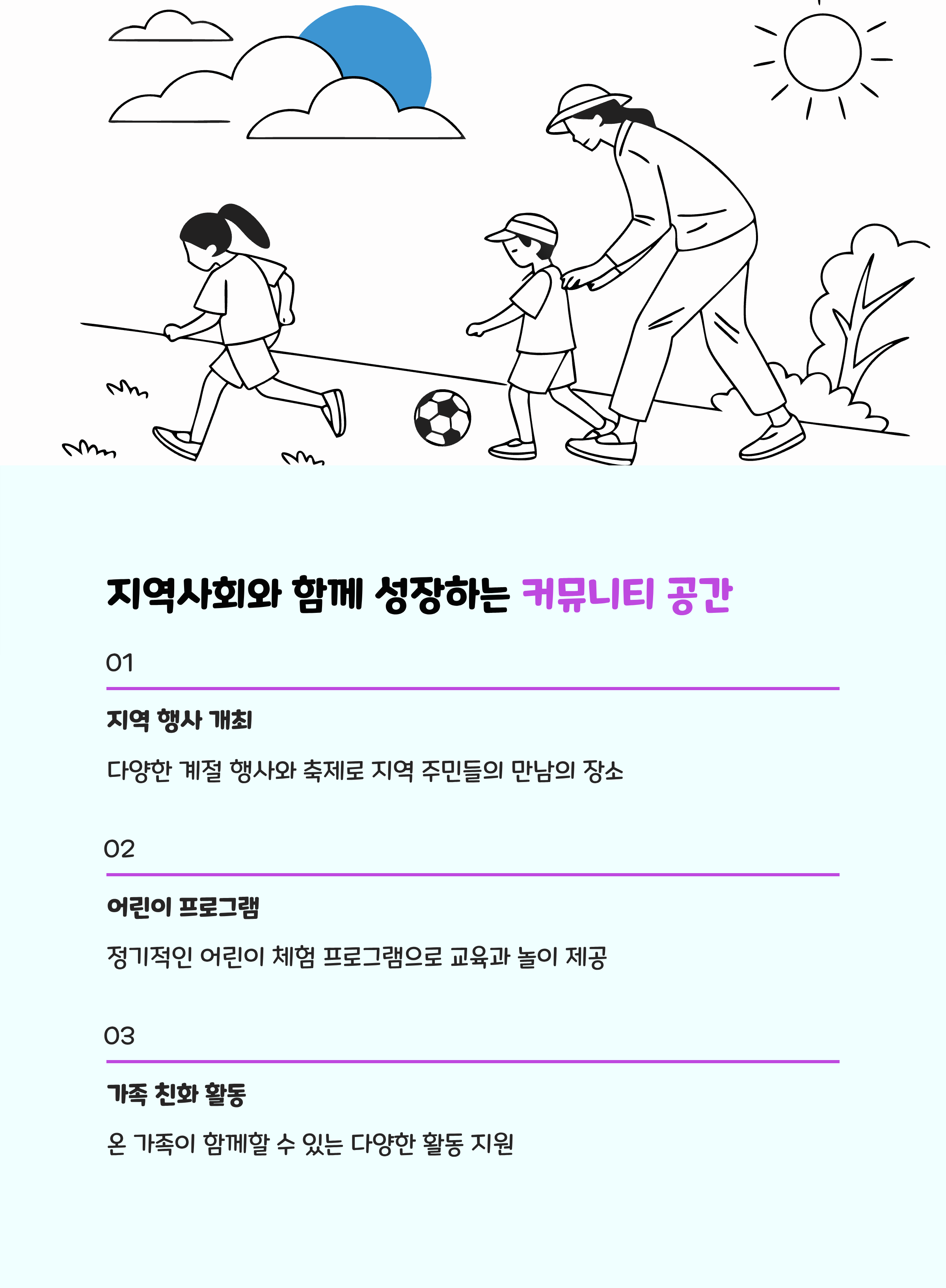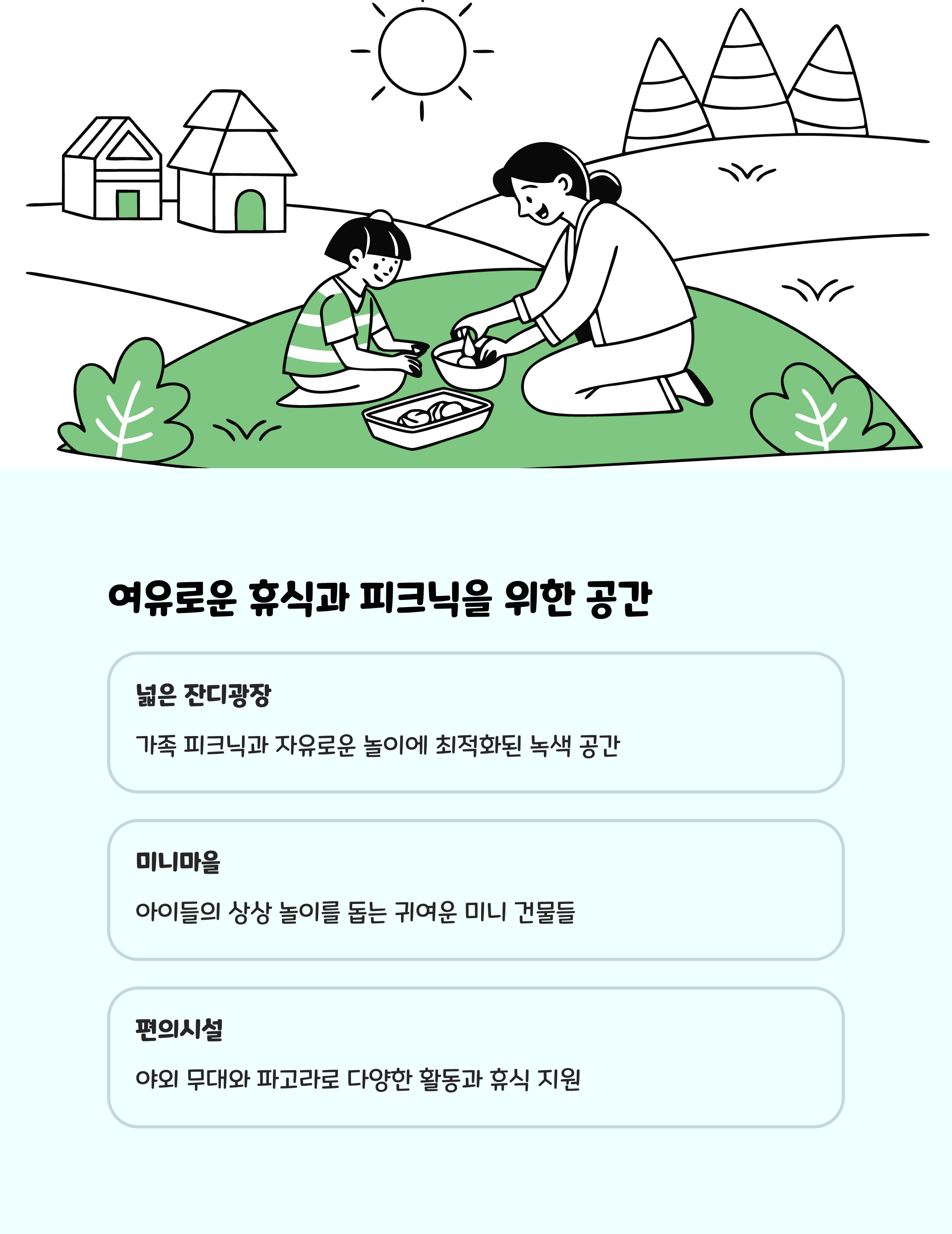 넓은 잔디광장 및 피크닉장: 도시락과 간식을 함께하며 여유로운 시간을 보낼 수 있음미니 마을: 아이들 눈높이에 맞춘 작은 마을 구조로 역할놀이 가능야외무대와 파고라: 공연 관람이나 가족 행사에 적합- 바비큐장, 급수대, 화장실, 관리사무소, 무료 주차장 등 부대시설 완비