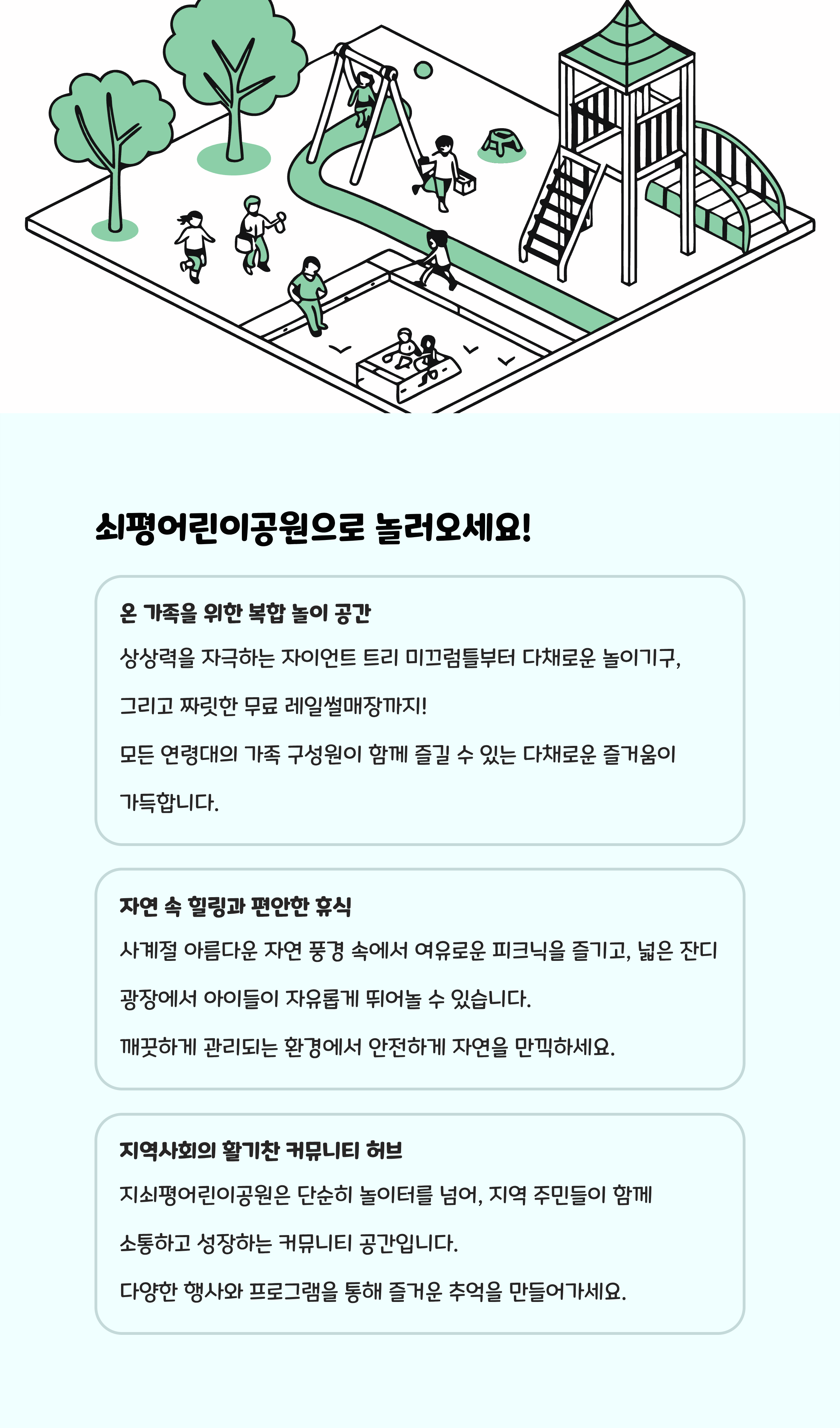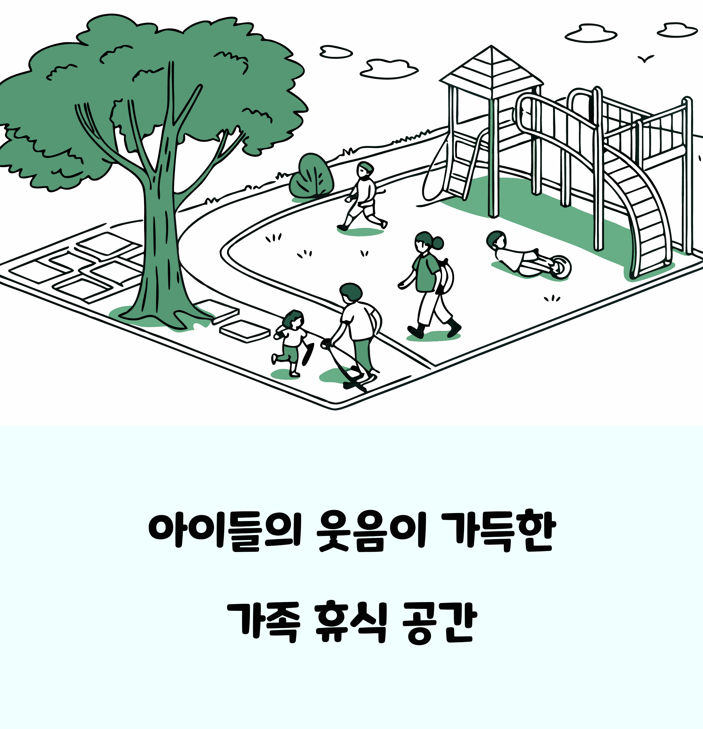 아이들이 놀이기구에서 신나게 놀고, 부모님은 잔디광장에서 휴식하며 피크닉을 즐길 수 있어 온 가족이 편안하게 시간을 보낼 수 있습니다.
