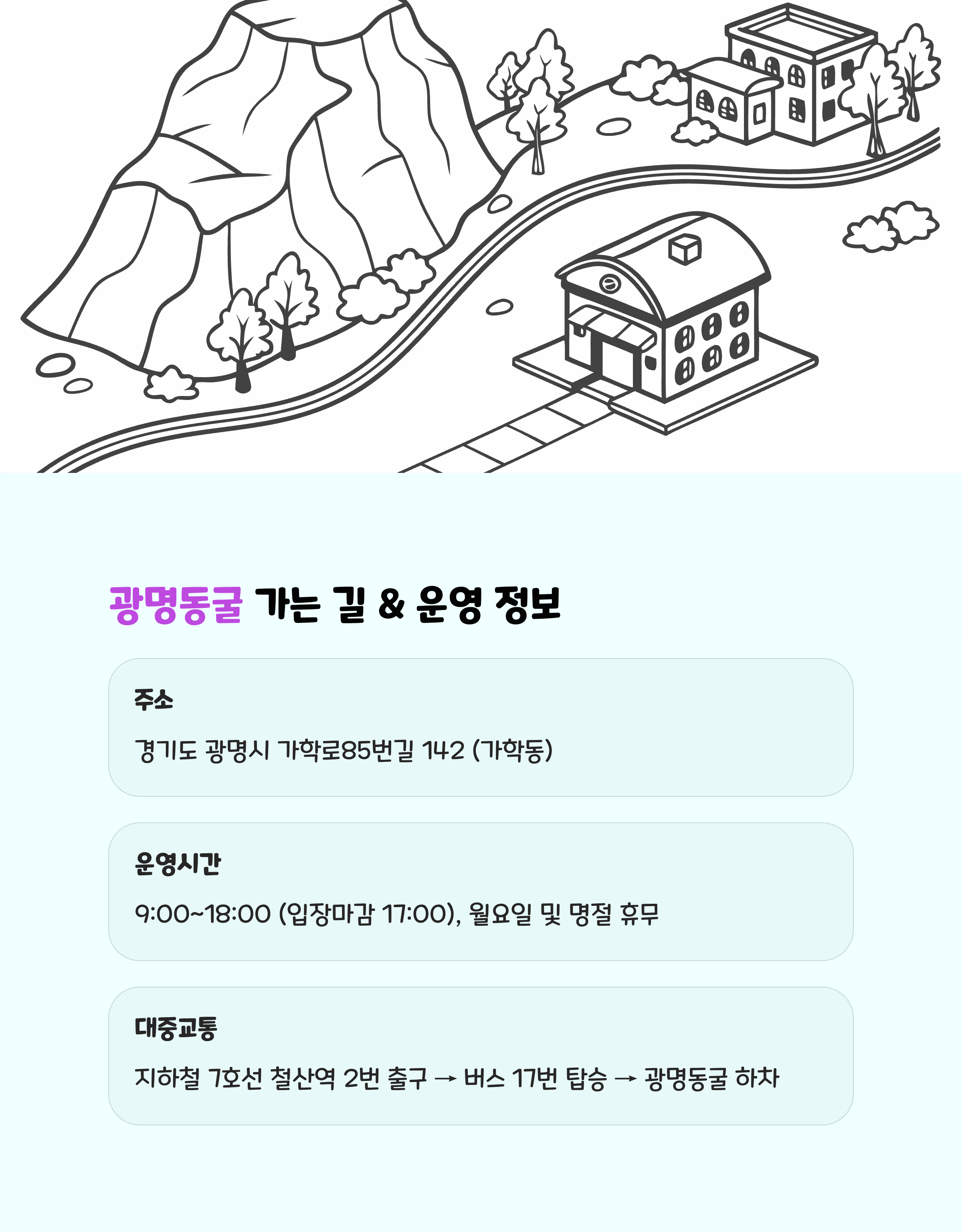 어린아이와 함께하는 여행은 안전과 편의, 재미를 모두 고려해야 합니다. 광명동굴은 연중 평균 10~12℃의 일정한 온도를 유지해 여름에는 시원하고 겨울에는 따뜻한 공간으로 아이들이 쾌적하게 탐험할 수 있는 환경을 제공합니다. 내부에는 유모차 반입이 어렵지만, 아이띠 이용이 가능하여 어린아이 동반 가족도 크게 어려움 없이 방문할 수 있습니다. 무엇보다도 동굴 내 역사적 흔적과 자연이 어우러진 공간이 아이에게 학습과 재미 두 마리 토끼를 잡게 해 줍니다.