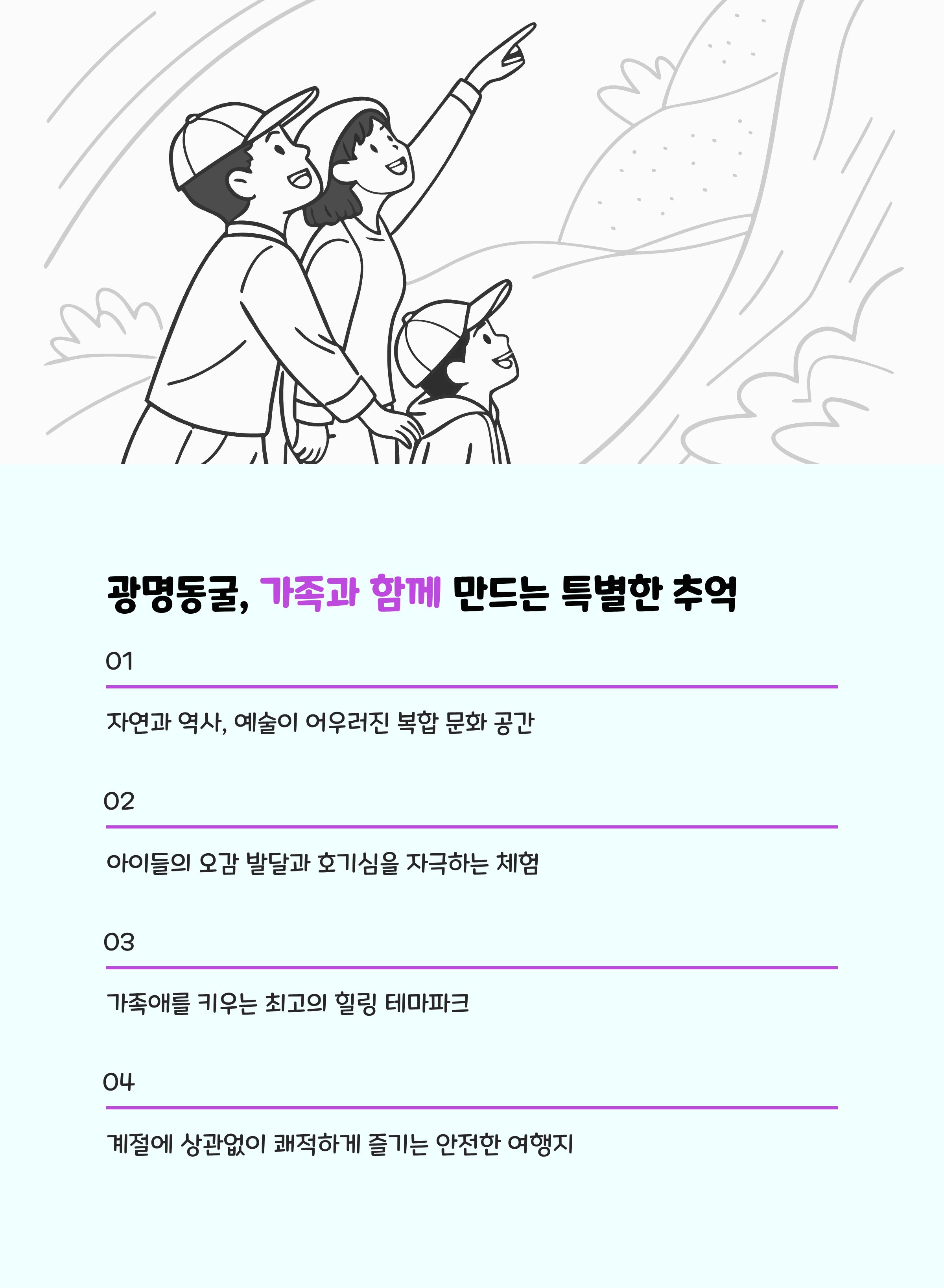 아이와 함께하는 광명동굴 가족 여행은 자연, 역사, 문화, 체험을 한 공간에서 즐길 수 있는 독특한 여행지입니다. 와인 동굴에서 성인들은 고급 와인을 경험하고, 아이들은 보물채취와 미디어 아트 등 다양한 활동에서 신나게 뛰어놀 수 있는 광명동굴로 가족 여행의 고민을 해결해 보시길 추천드립니다.