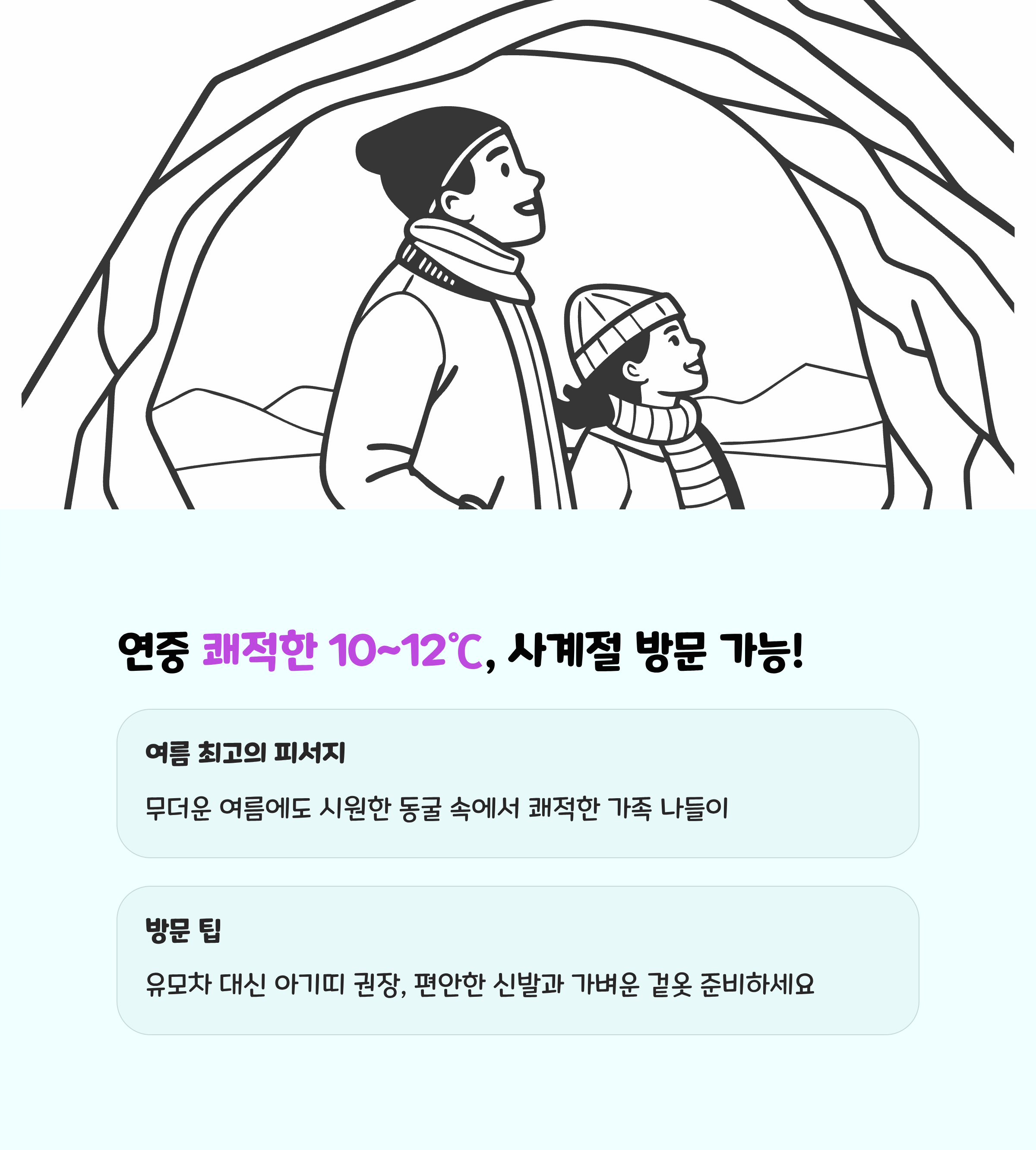 - 여름철 방문 시 가벼운 가디건을, 겨울철에도 동굴 내부는 크게 춥지 않으나 가벼운 겉옷 준비가 필요합니다.