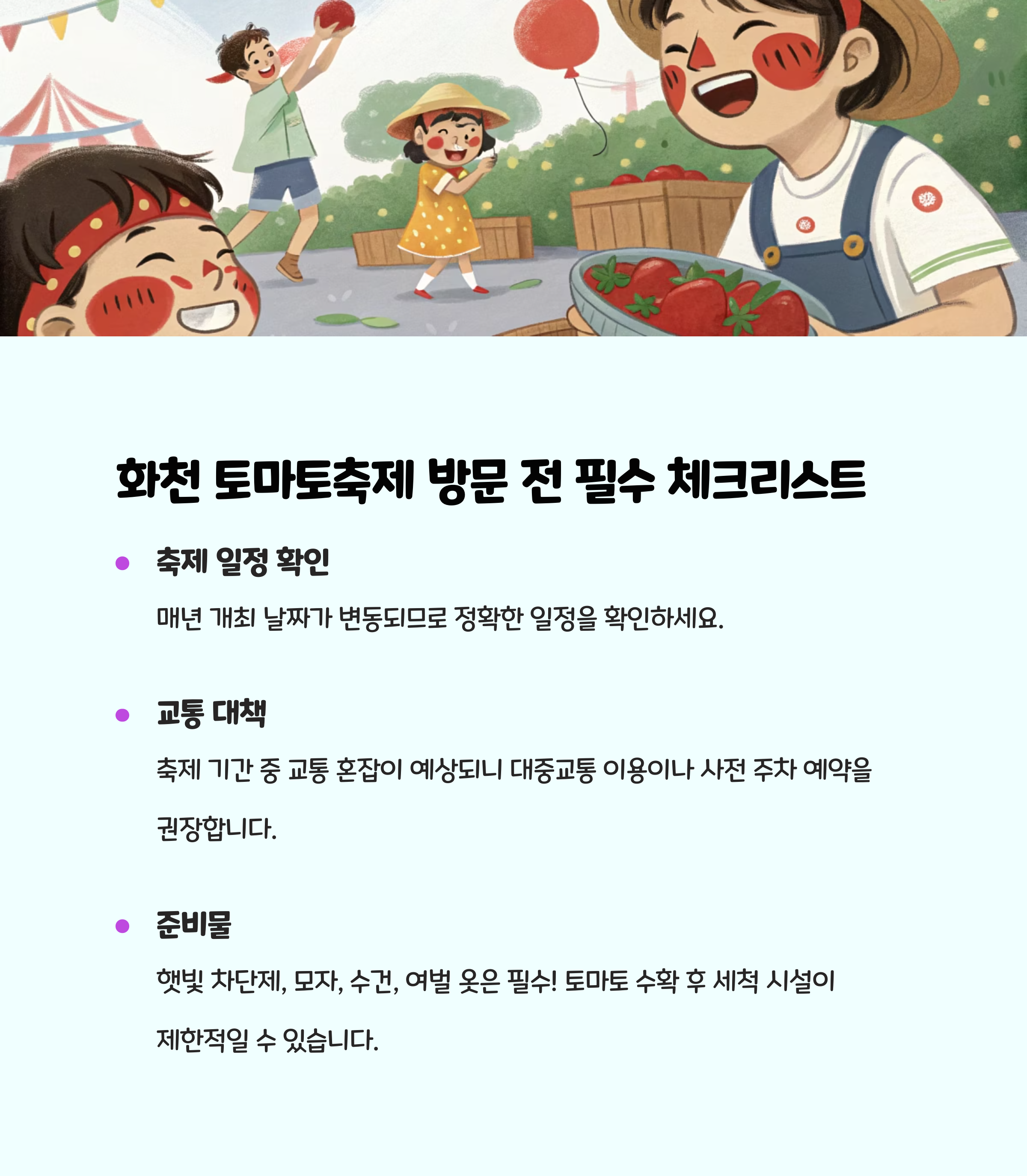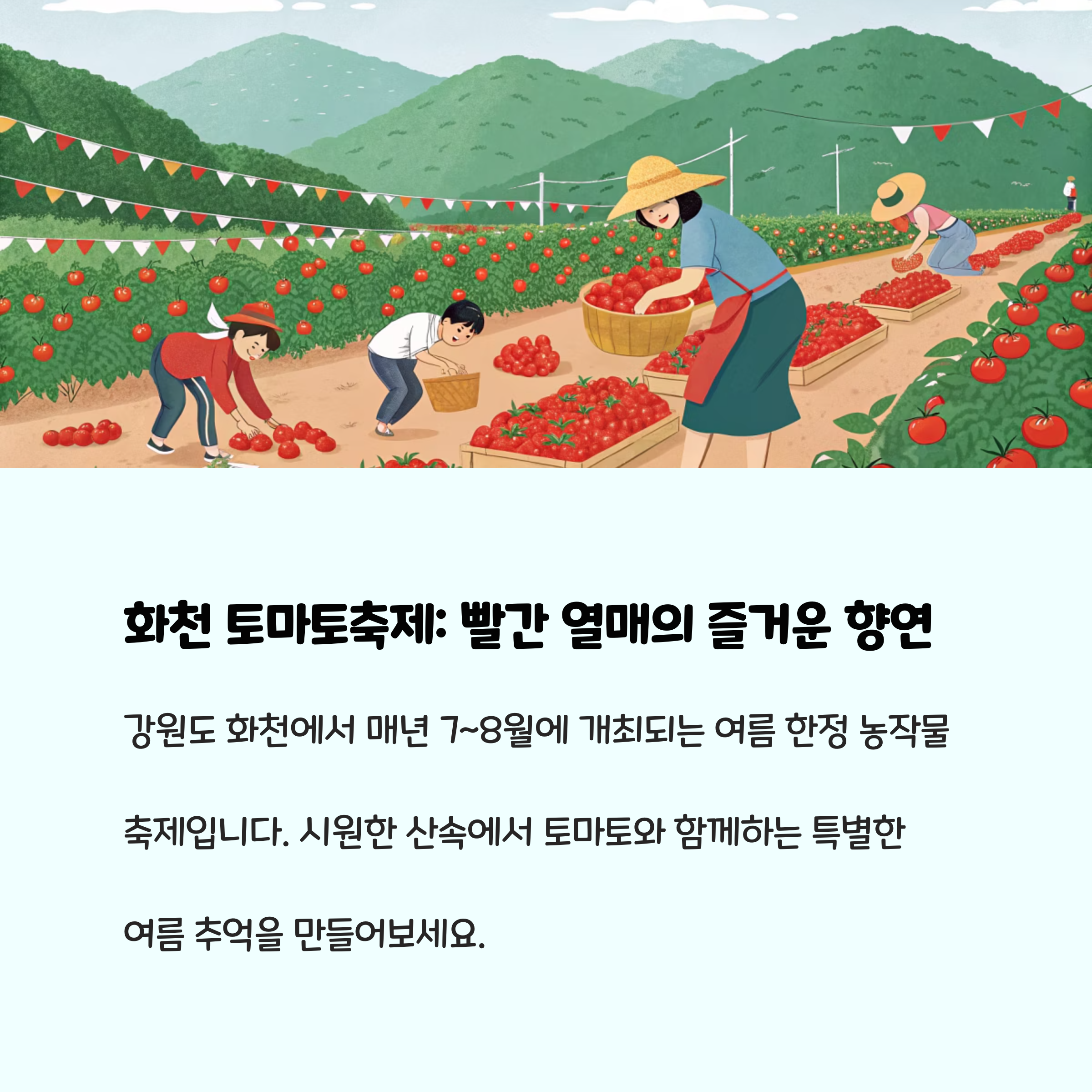 | 화천 토마토축제 & 체험마을 | 토마토 수확, 농작물 체험 | 농업 체험, 여름 축제 |