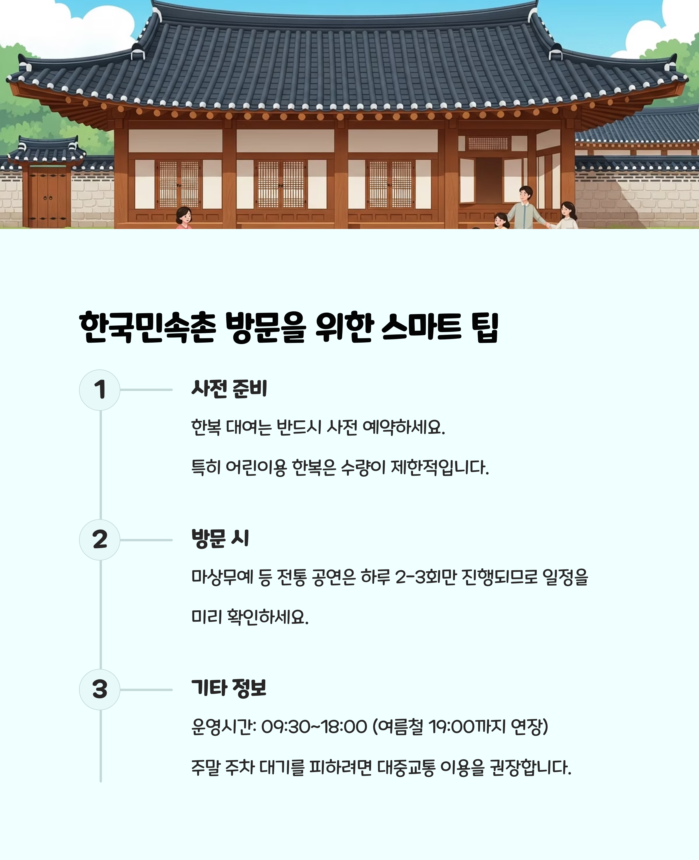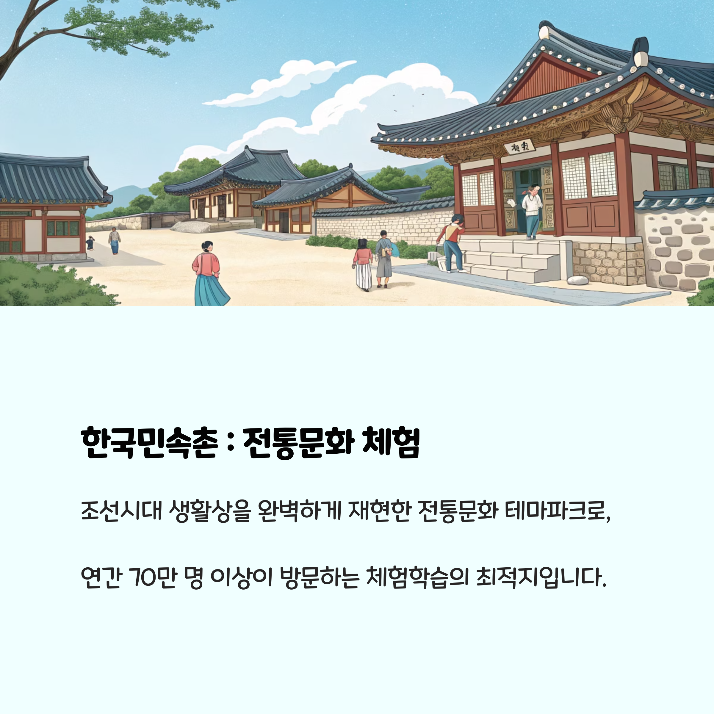| 한국민속촌 | 한복, 전통놀이, 활쏘기 | 전통문화, 역사 체험 |
