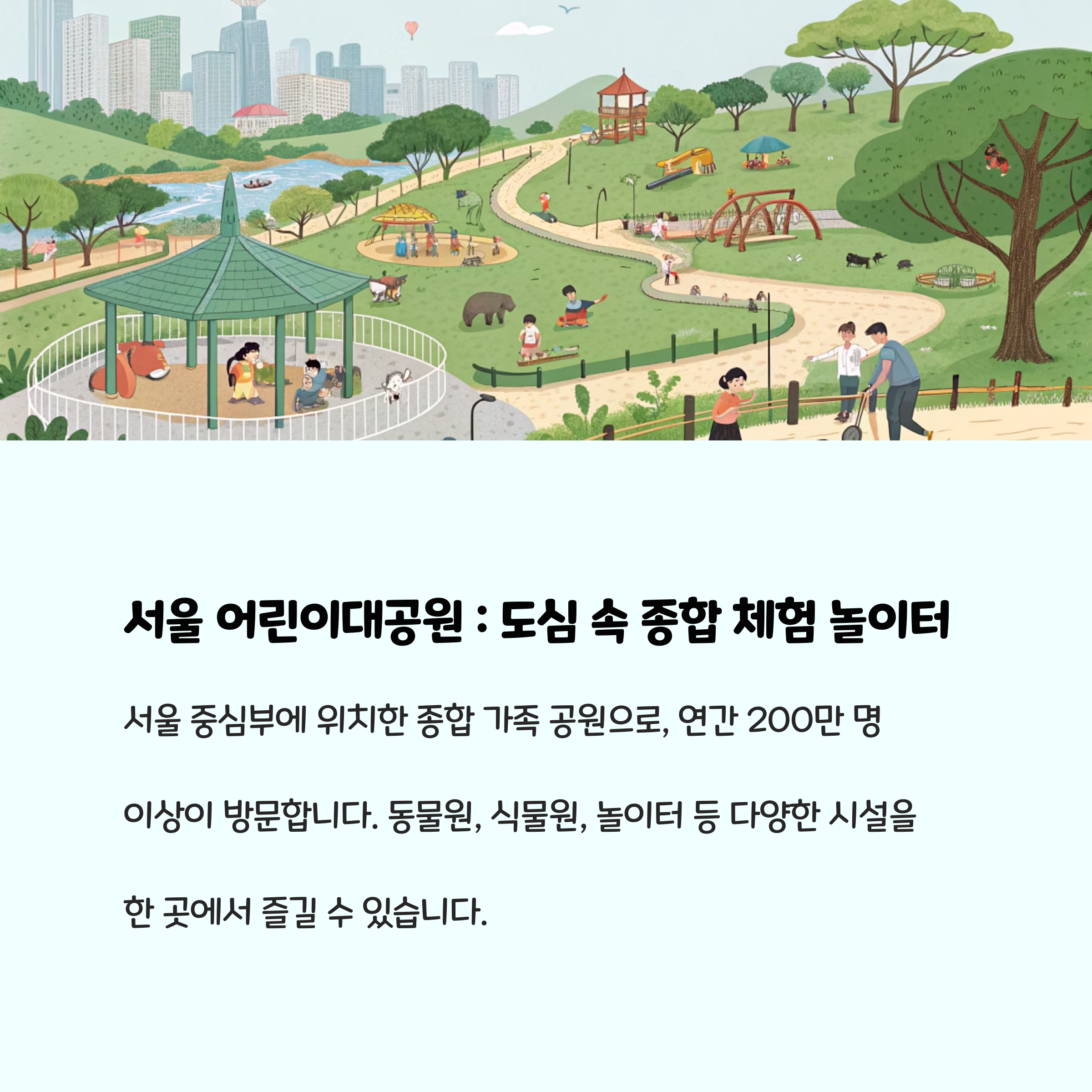 | 서울 어린이대공원 | 동물원, 식물원, 놀이터 | 자연·과학·문화 체험 |