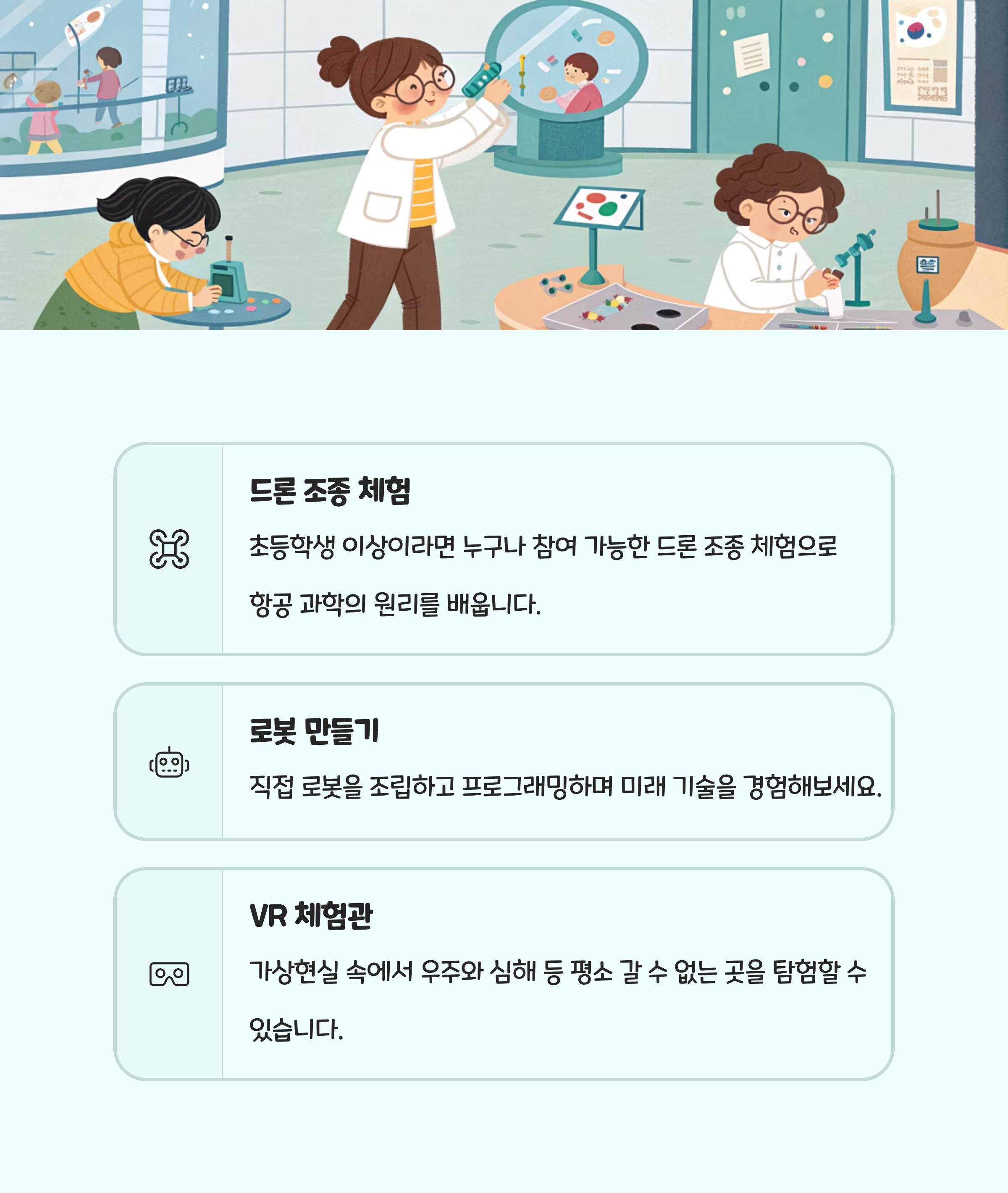 | 국립과천과학관 | 과학 전시, 드론·로봇, VR | 과학 체험, 실내 활동 |