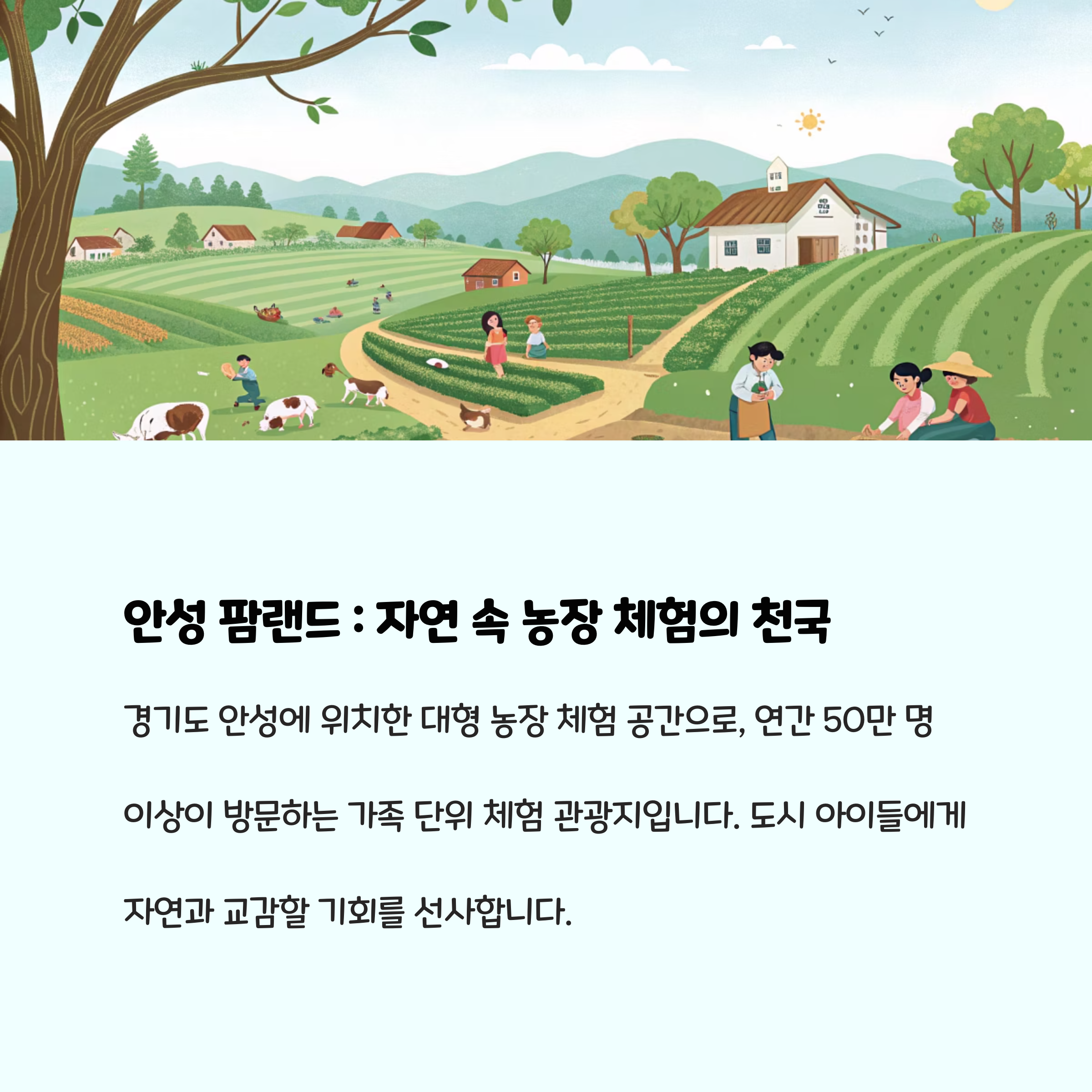 | 안성 팜랜드 | 동물 먹이주기, 트랙터 타기 | 농촌 체험, 자연 교감 |
