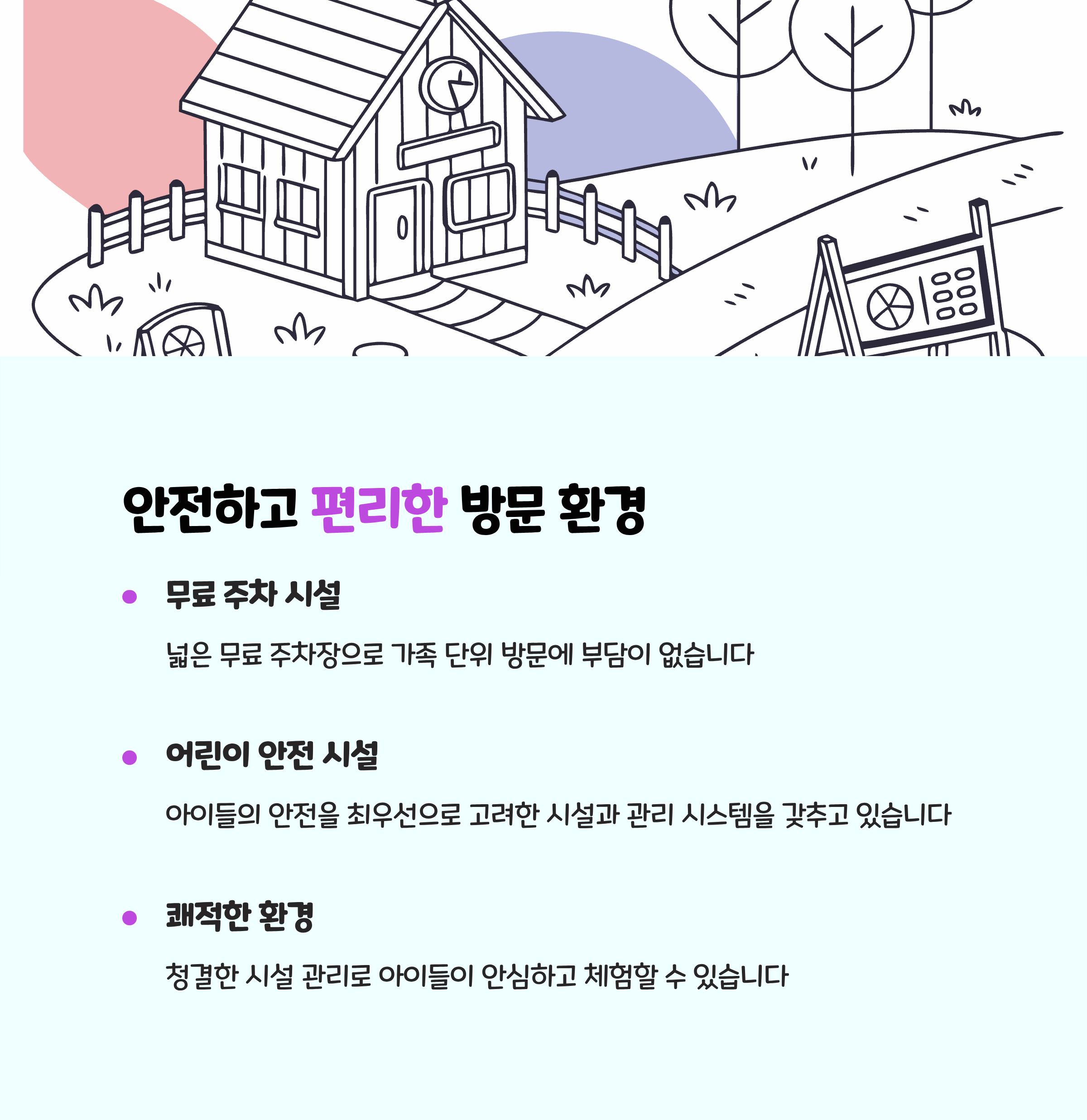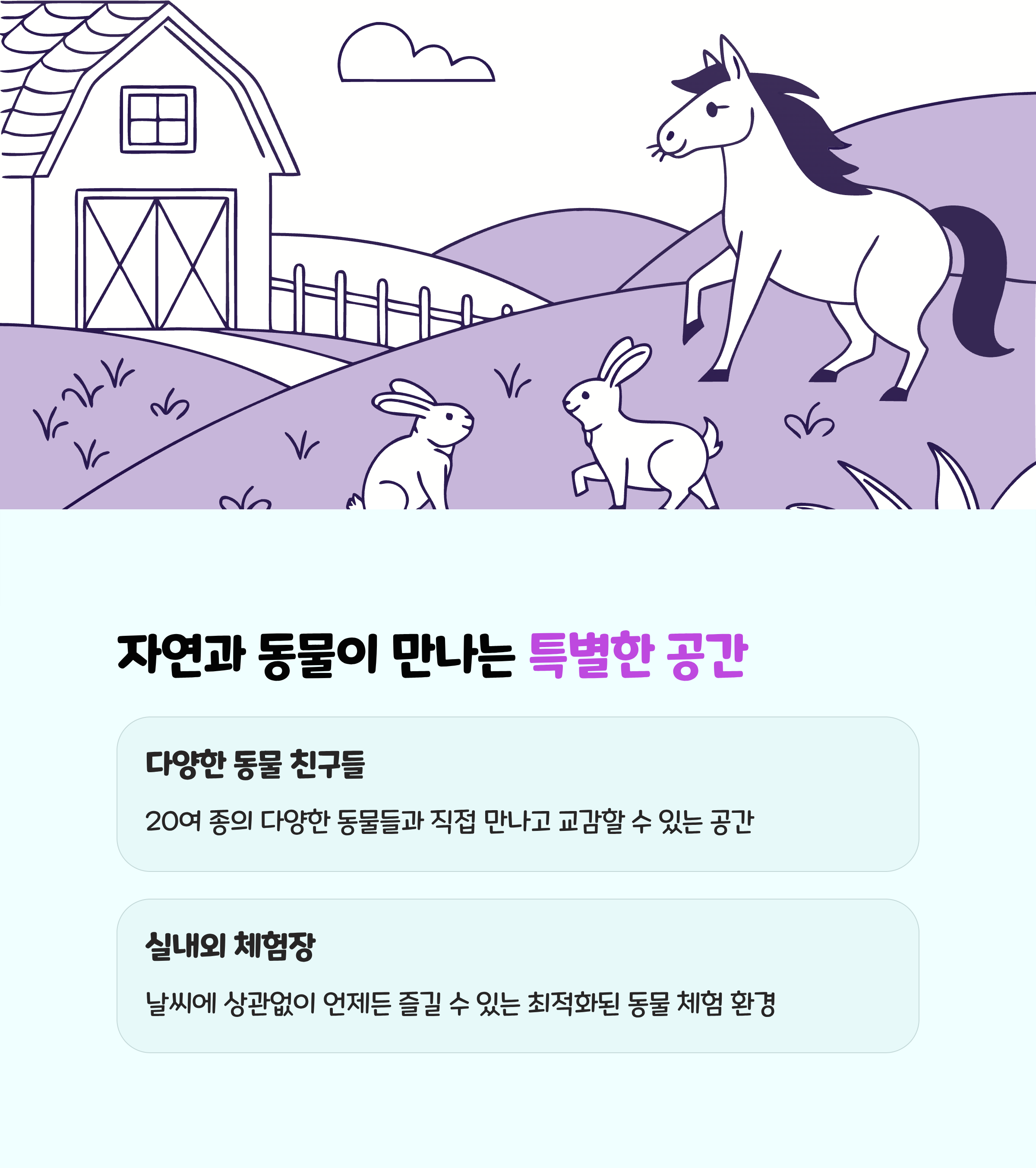 - 날씨와 무관하게 방문 가능하며 실내동물체험장 덕분에 겨울, 비 오는 날에도 체험이 가능합니다.
