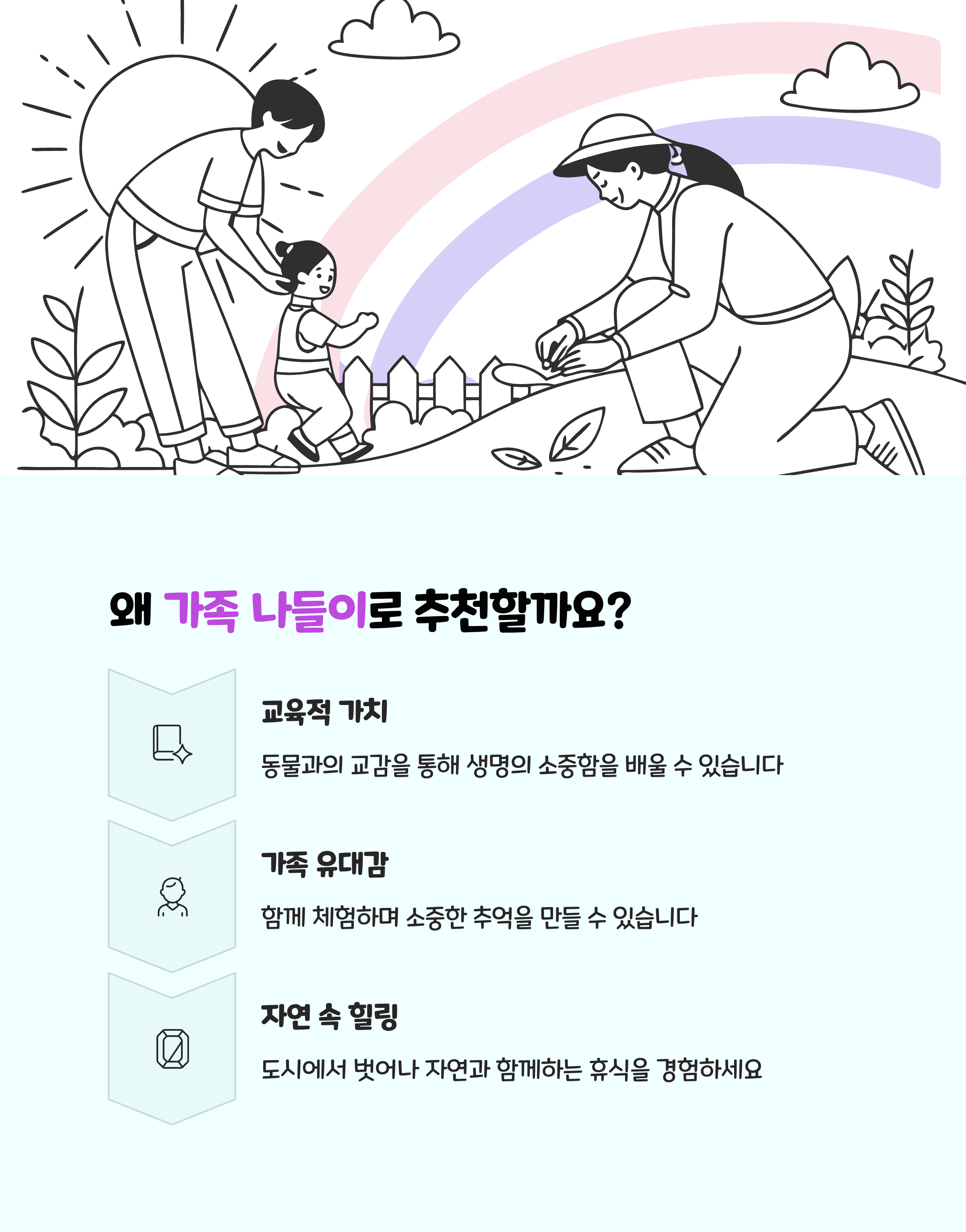 - 날씨와 무관하게 방문 가능하며 실내동물체험장 덕분에 겨울, 비 오는 날에도 체험이 가능합니다.