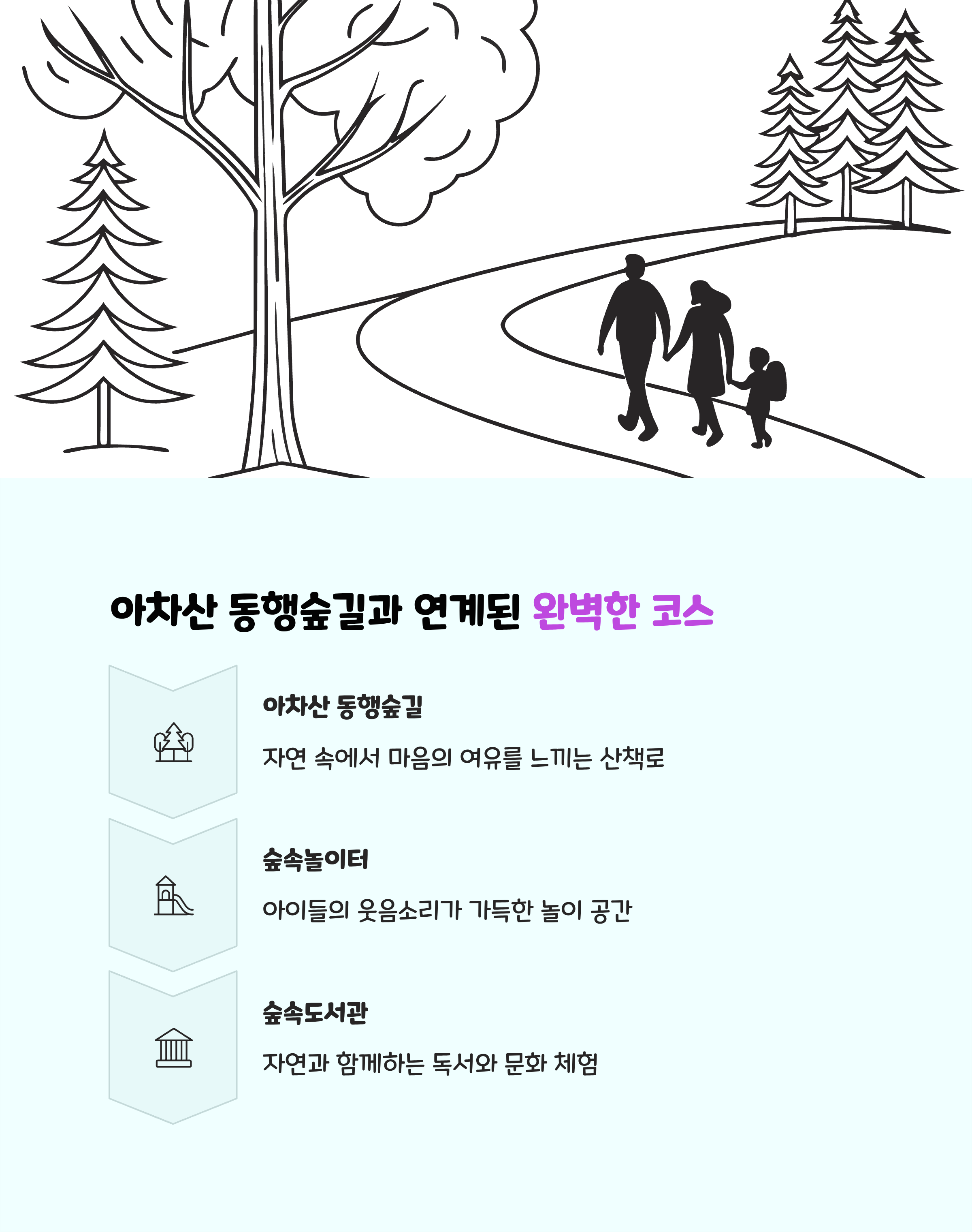 입구→숲속도서관→어울림광장→숲속놀이터 동행숲길로 평탄해 어르신과 어린이 모두 편안합니다.
