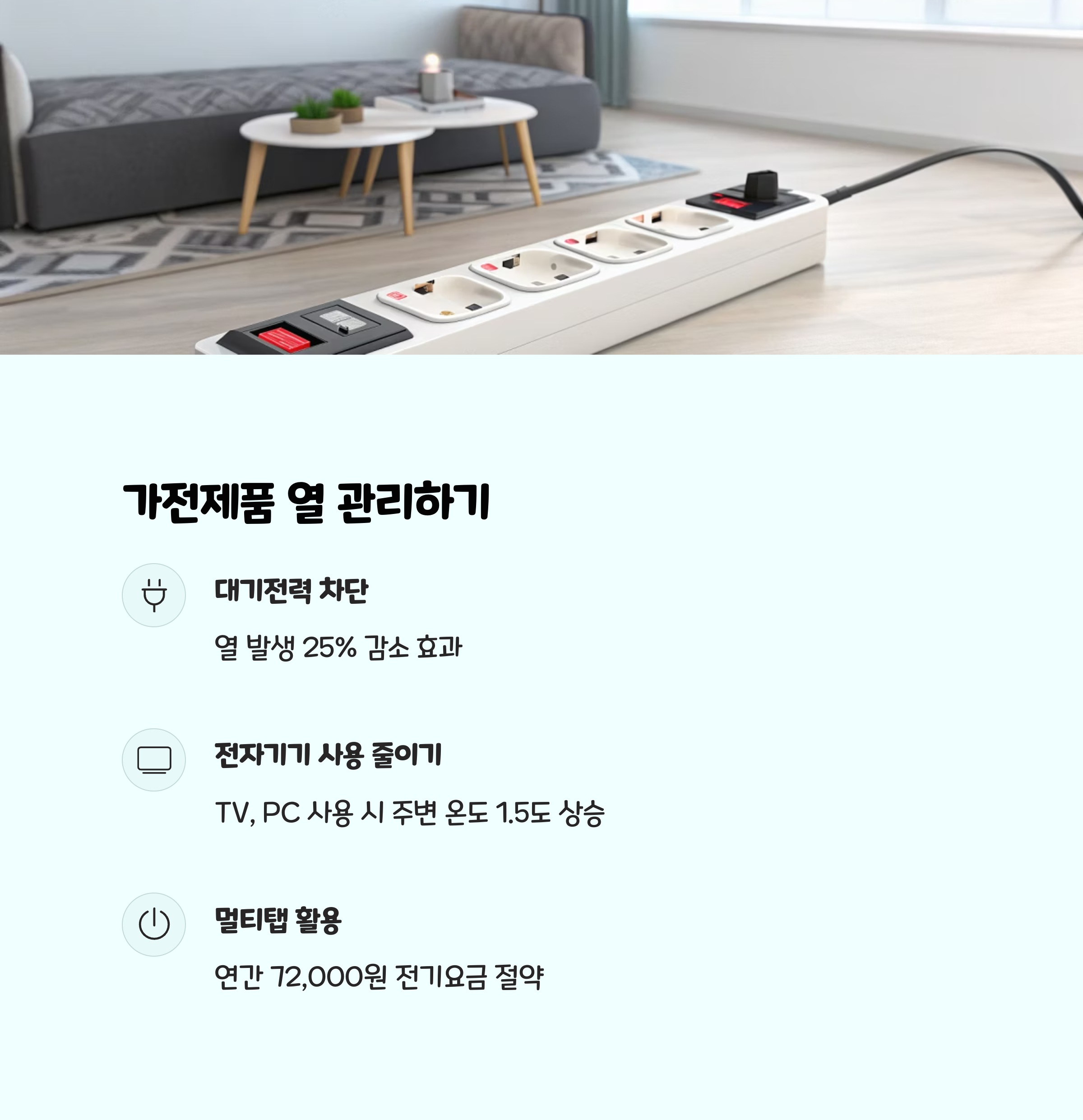 실내에서 발생하는 열도 무시할 수 없습니다. 백열전구, TV, 컴퓨터 등 가전제품은 사용하지 않을 때 반드시 플러그를 뽑아두세요. 백열전구는 LED로 교체하고, 요리나 다림질 등 열을 많이 내는 활동은 해가 진 뒤로 미루는 것이 좋습니다.