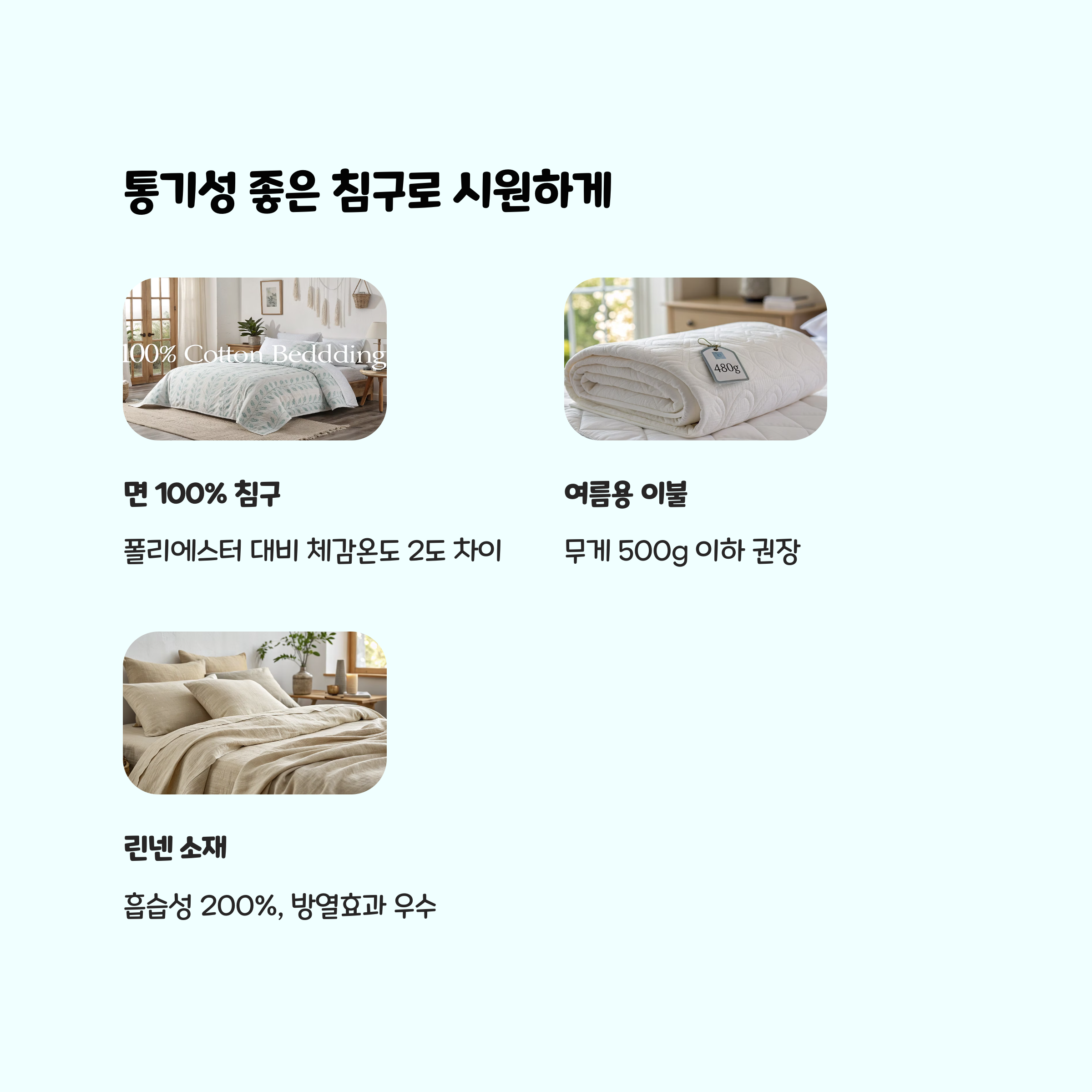 잠들기 전 시트와 베개 커버를 냉동실에 15~30분간 넣어두었다가 사용하면, 체감 온도가 빠르게 내려가 쾌적한 수면을 취할 수 있습니다. 또한, 면이나 린넨 등 통기성이 좋은 침구를 사용하면 땀과 열이 쉽게 배출되어 숙면에 도움이 됩니다.