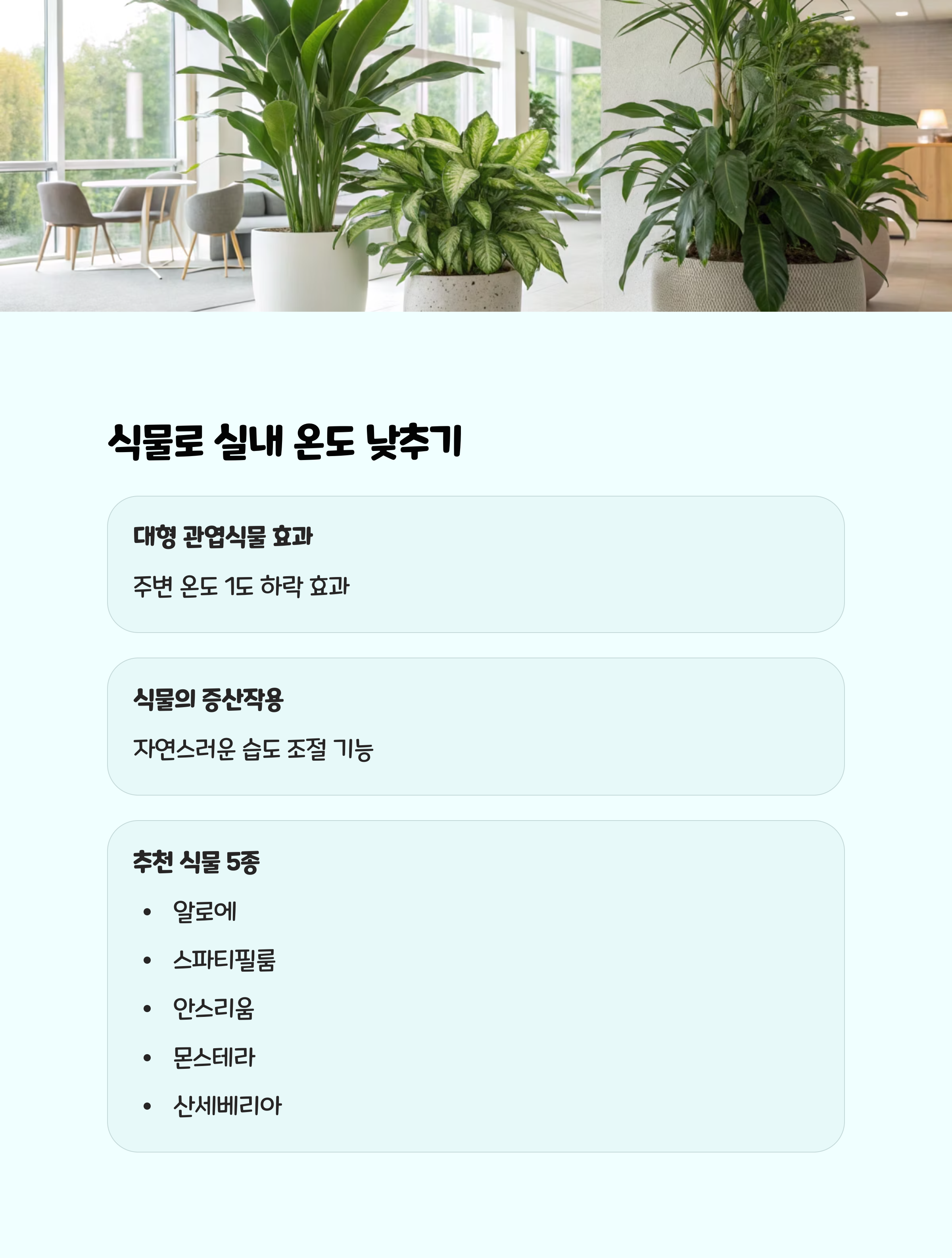 실내에 공기정화 식물을 배치하면 온도와 습도 조절에 도움이 됩니다. 식물은 증산작용을 통해 실내 공기를 쾌적하게 만들고, 열을 흡수해 온도 상승을 완화합니다. 산세베리아, 스투키 등 관리가 쉬운 식물을 추천합니다.