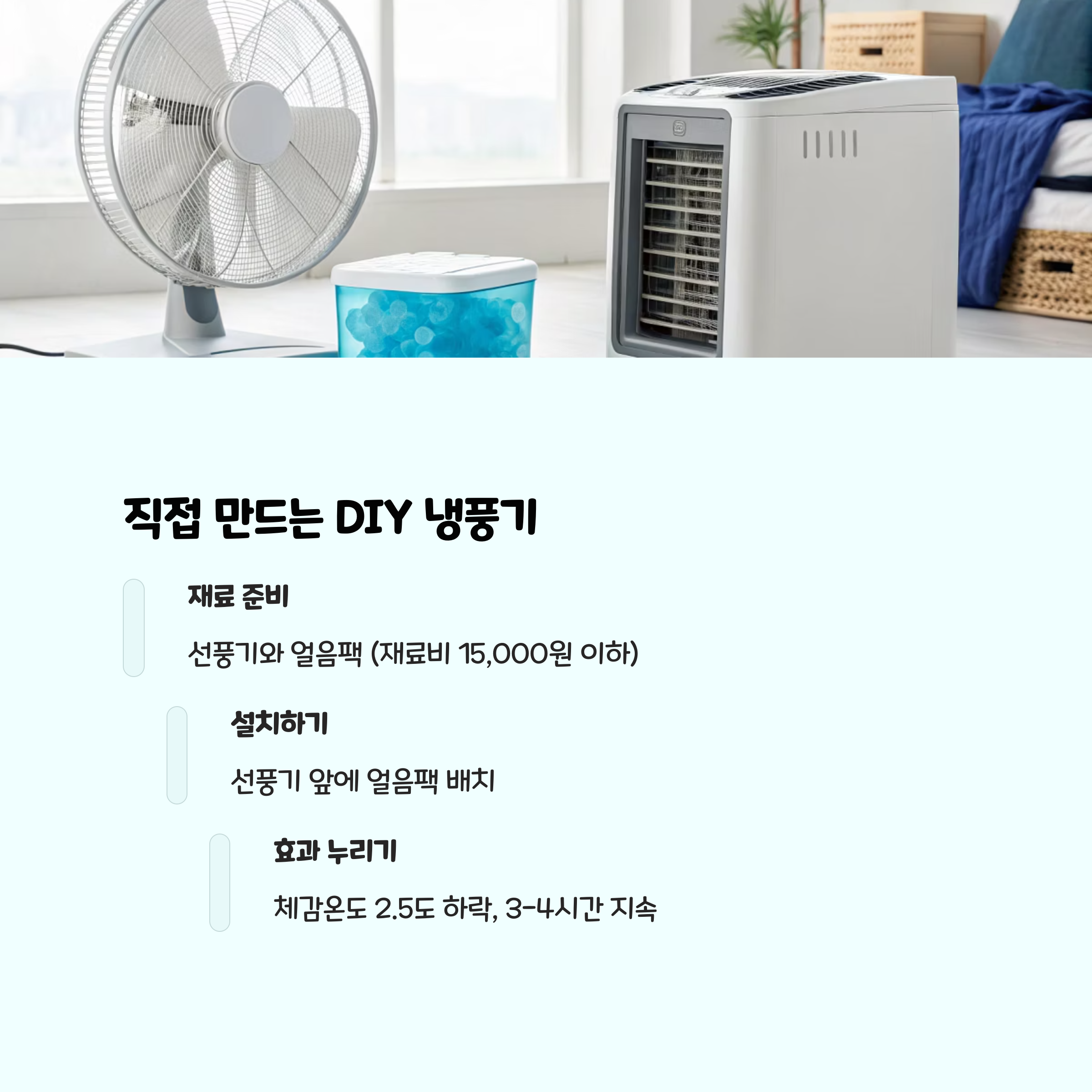 즉각적인 냉방 효과를 원한다면, 얼음이나 얼린 물병을 선풍기 앞에 놓아 ‘즉석 드라이 에어컨’을 만들어보세요. 선풍기 바람이 얼음 위를 지나가면서 차가운 공기가 실내로 퍼져, 실제로 체감 온도가 2도 이상 낮아지는 효과를 경험할 수 있습니다. 아이스팩은 수건에 감싸서 몸에 직접 대거나, 그릇에 담아 선풍기 앞에 두는 것이 좋습니다.